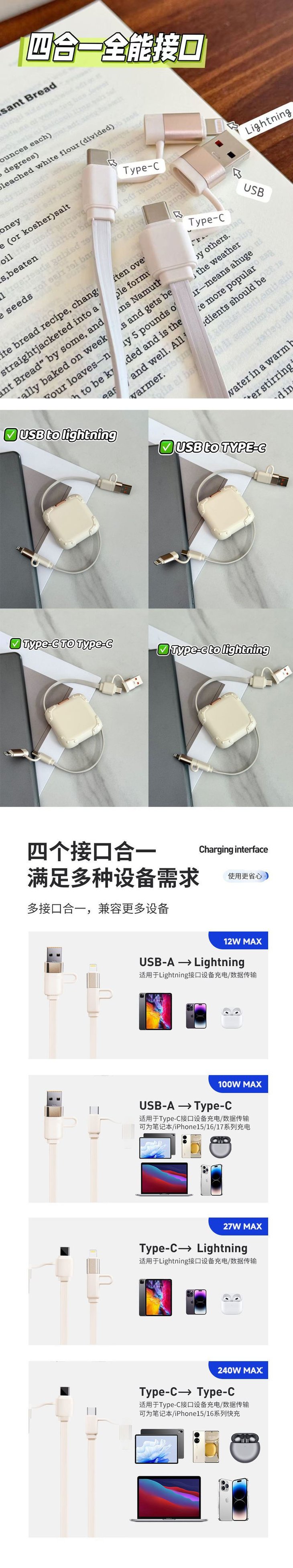 ✅四合一接口,匹配各种手机、笔记本电脑、耳机、音箱等设备 家里设备接口多?有它一根就够了—— USB/Type-C双输入插头,灵活切换 搭配Type-C➕苹果lightning双输出口 相当于: 1️⃣Type-C→Type-C 2️⃣USB-A→Type-C 3️⃣Type-C→Lightning 4️⃣USB-A→Lightning 四线🧵合一 👉🏻Type-C接口支持240W极速快充,苹果15-17、华为/小米/OPPO/VIVO等品牌安卓机型充电速度狂飙,最快30分钟🉑充🈵 👉🏻Lightning接口适配苹果8-14系列机型,PD快充协议加持,充电稳定不弹窗 充电速度直接拉满❗️比普通数据线快3倍都不止,喝杯咖啡的功夫,设备电量全补满❗️ 出差赶时间、通勤路上、居家刷剧、办公赶方案,随时快速满血复活🔋 一根顶四根,旅行时不用纠结带哪根,出差时同事借线也能轻松应对❗️