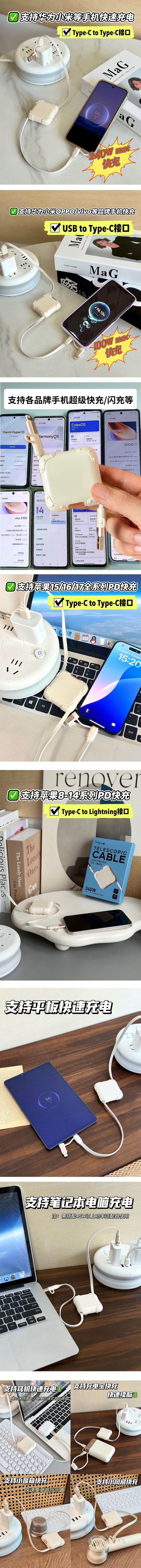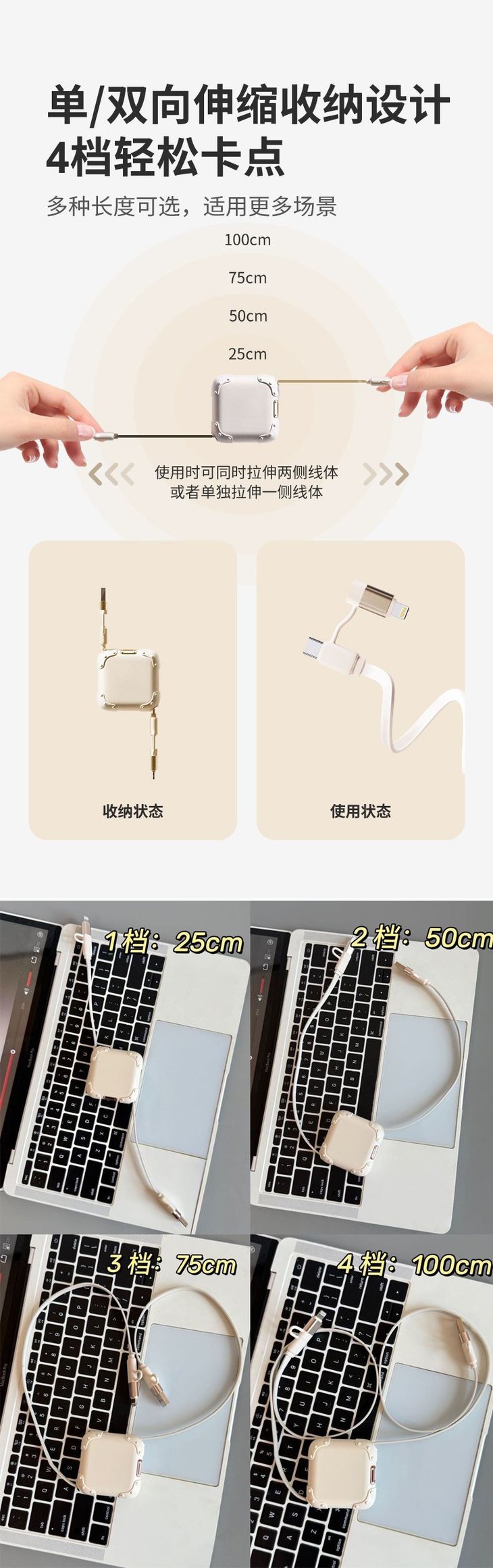✅国内首创单手任意拉模式,单边/双边均可任意拉伸,彻底告别线团缠绕❗️1米抽拉:25-100cm四档自由伸缩,超薄小巧设计,收纳仅掌心大小❗️ ✅四接口通吃:Lightning/Type-c/USB,苹果全系列(8-17系列)以及所有安卓品牌机型、平板、笔记本电脑以及周边设备统统适用❗️ ✅Type-C接口支持240W超级快充,最快30分钟充满,同时兼容华为/小米/OPPO/VIVO等品牌120W/100W/66W/40W/22.5W超级快充/闪充,充电/传输数据两不误❗️ ✅10000+次弯折测试,品质保障,加粗铜芯,抗摔耐磨❗️