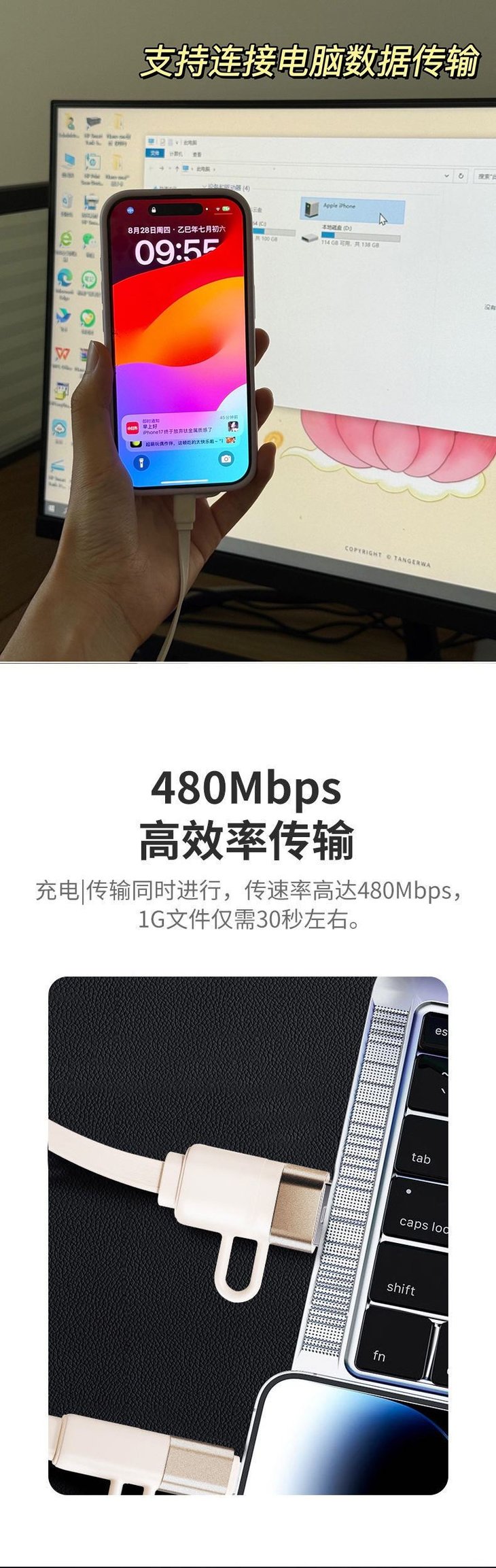 ✅数据线还支持USB/Type-C高速数据传输 苹果/安卓都可以实现快速数据传输👍 每秒传输速率可达480Mbps 传输1GB文件仅最快需约30秒⚡️ 实现充电与数据传输同步高效完成👍