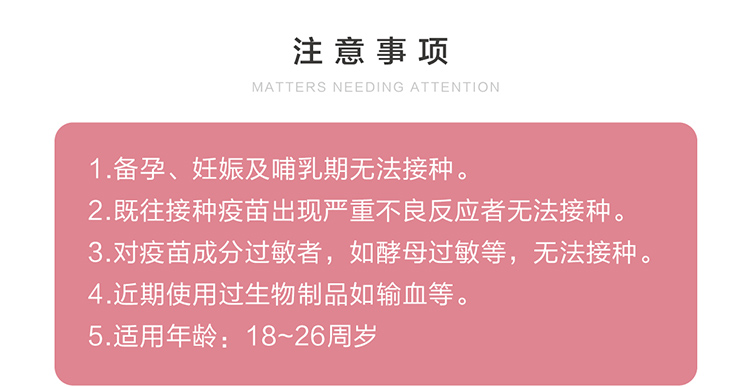 1、九价宫颈疫苗适用年龄18~45岁,超年龄不可接种,备孕、妊娠、哺乳期无法接种,请避开经期