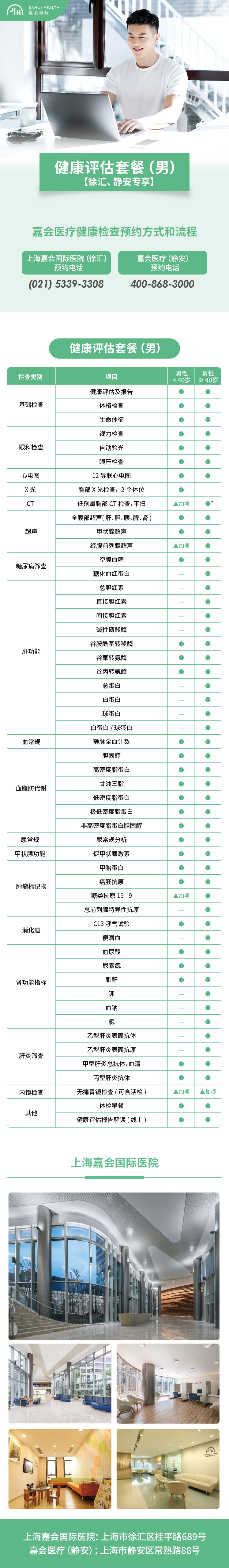 * 由于嘉会医疗嘉静诊所(静安) 暂无CT设备,≥40岁套餐中的胸部CT项目,可至上海嘉会国际医(徐汇)进行检查。