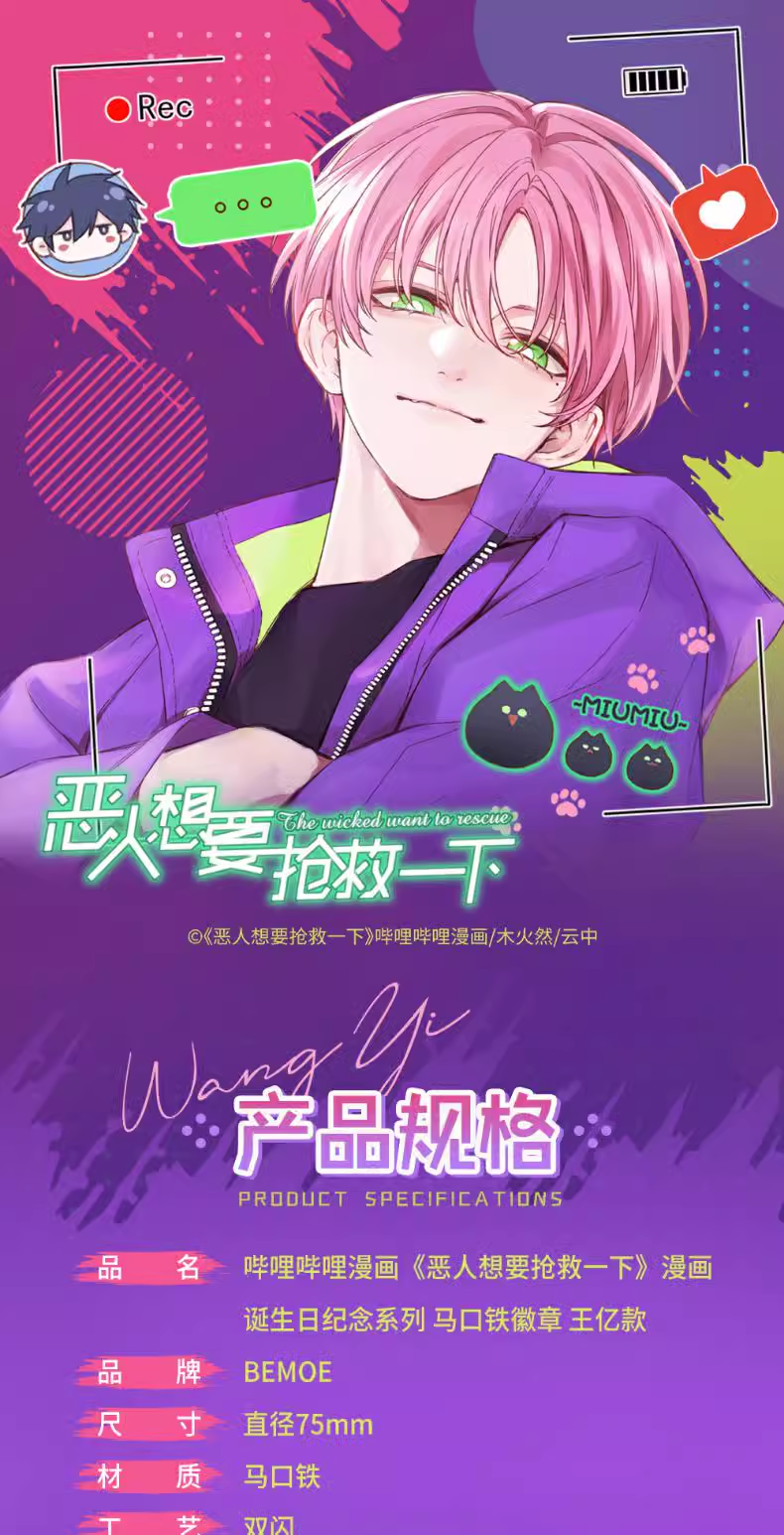 BilibiliGoods 恶人想要抢救一下 诞生日纪念系列 马口铁徽章 王亿款BMEC6937082625699