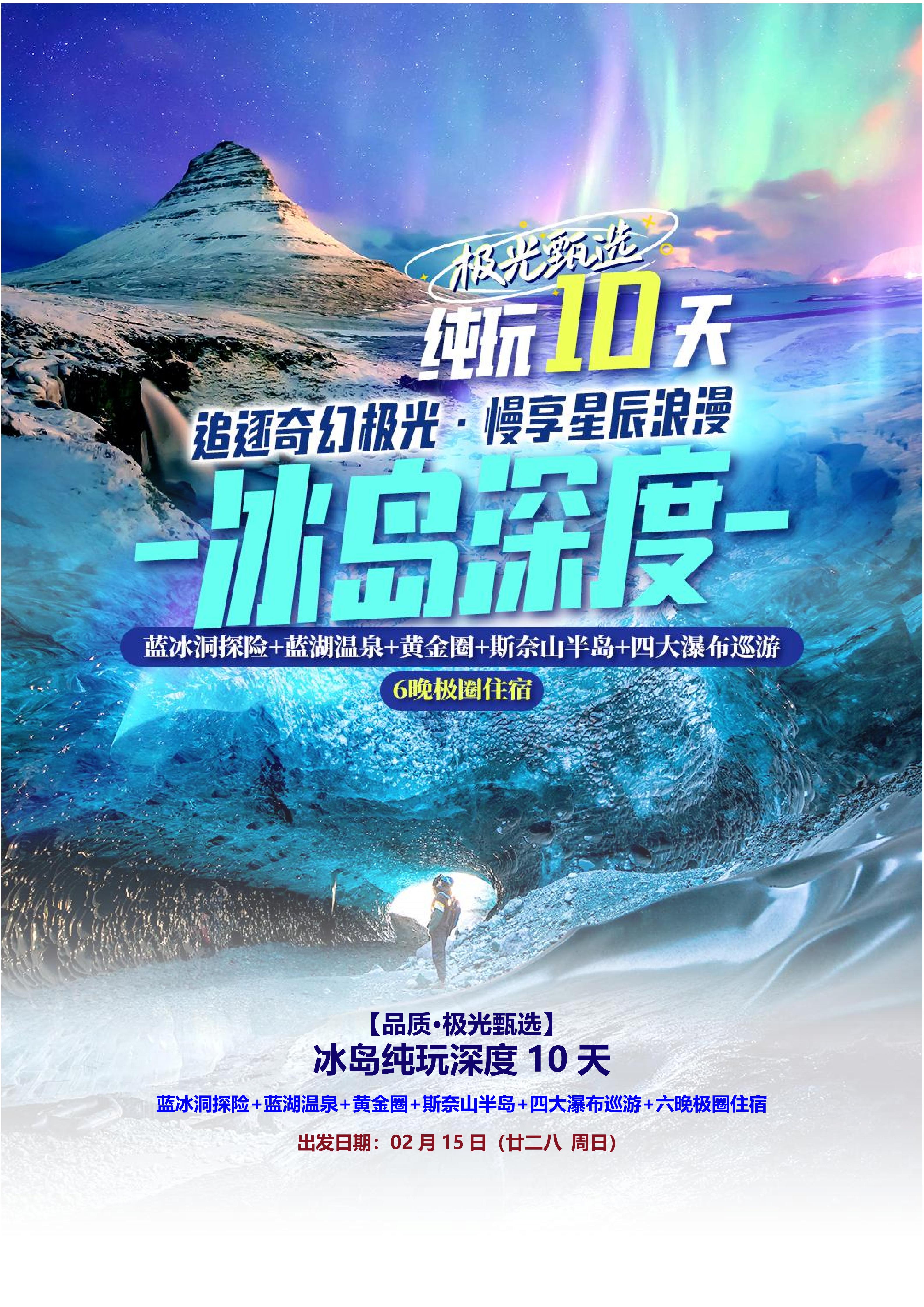 【春节】<北欧·冰岛一地深度纯玩10天>蓝冰洞探险+蓝湖温泉+黄金圈+斯奈山半岛+四大瀑布巡游+六晚极圈住宿