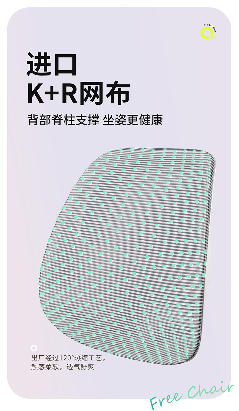 靠背采用进口K+R网布,弹力足,能很好地给背部脊柱支撑,同时触感也很柔软。透气网格给背部及时排汗,保持后背干爽。