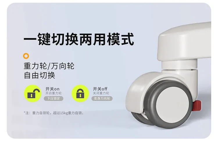 打开开关,下压锁定,开启重力轮,轮子就固定住了。
