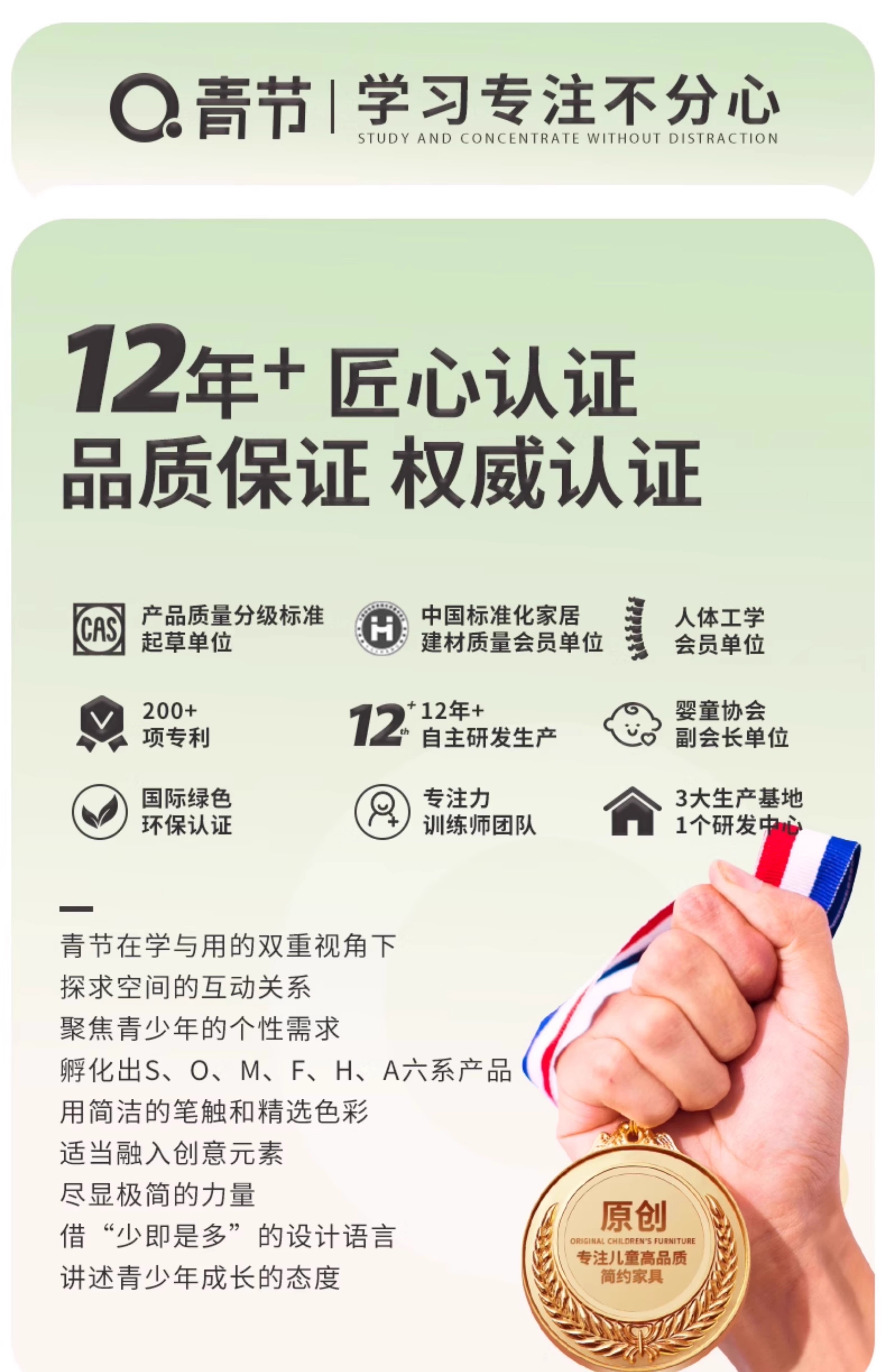 而青节学习桌,就根据人体工学设计,让孩子坐上不用费力,就能保持三个90度的标准坐姿,坐得稳固安全又舒服!