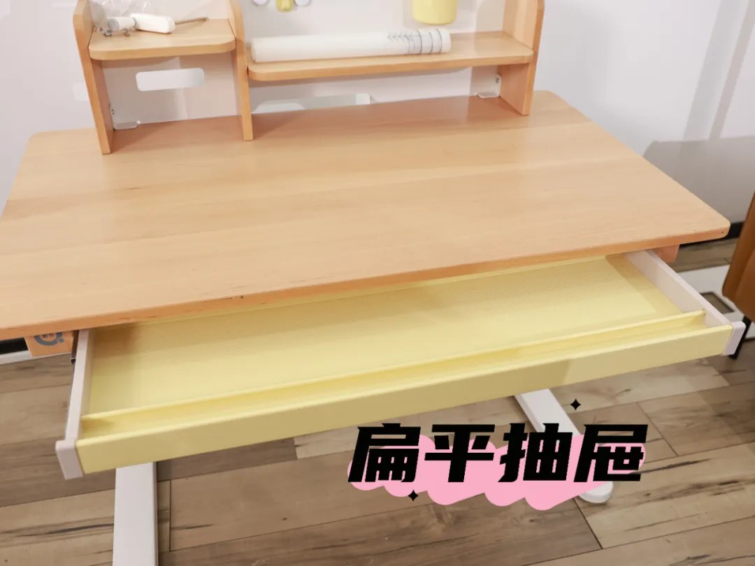 咱们桌子还自带一个扁平抽屉,画本、图册、A4纸,都能放。
