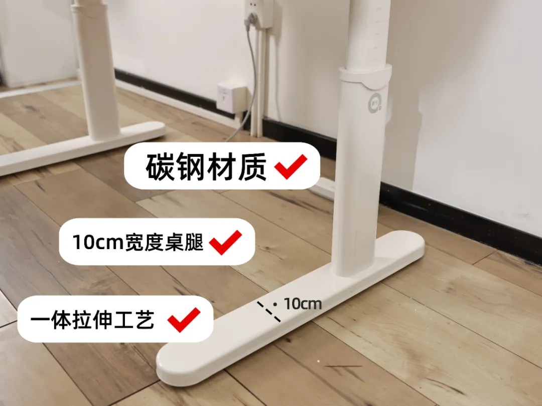 桌腿的材质是中碳钢,宽度足足有10cm,采用一体拉伸工艺,很牢固稳定。无横档设计不挡腿,非常舒适。