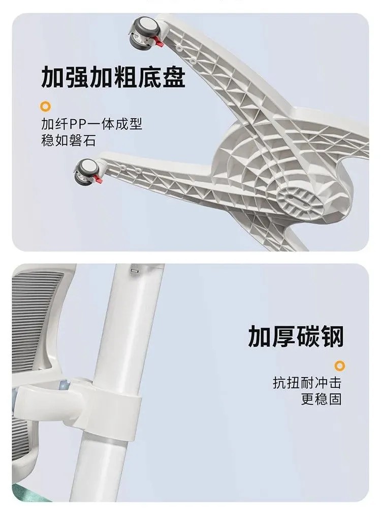 椅子的底盘是呈U字型,筋位全部加粗加强,非常稳固;背杆也是用了加厚碳钢,抗扭耐冲击。