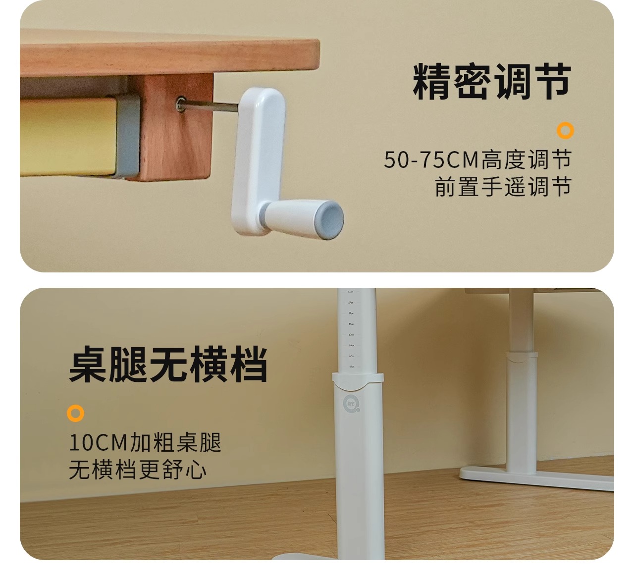 而青节学习桌的桌面高度可调节范围很广,在50cm-75cm,轻松适配各个身高、各个年龄段。