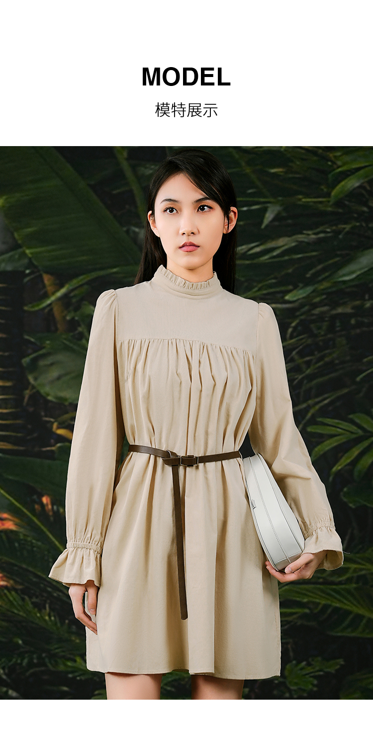 NUTS春秋季新款纯色收腰显瘦褶皱气质A字短款连衣裙女411101359