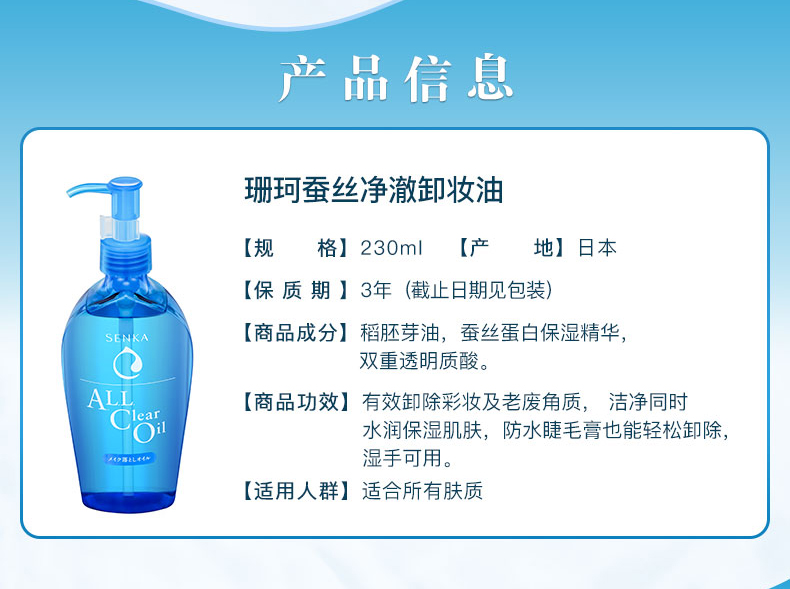 资生堂珊珂(SENKA)蚕丝净澈温和卸妆油230mL(日本进口原洗颜专科/卸妆液/深层清洁/男女适用)