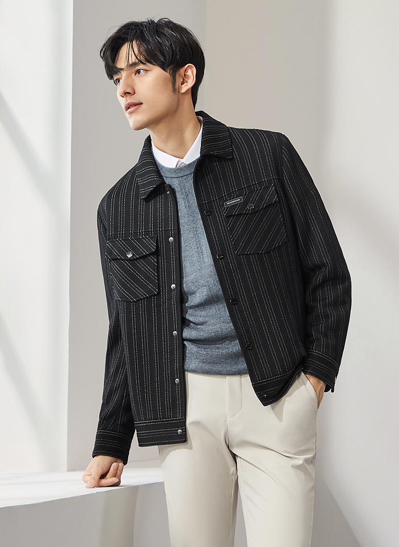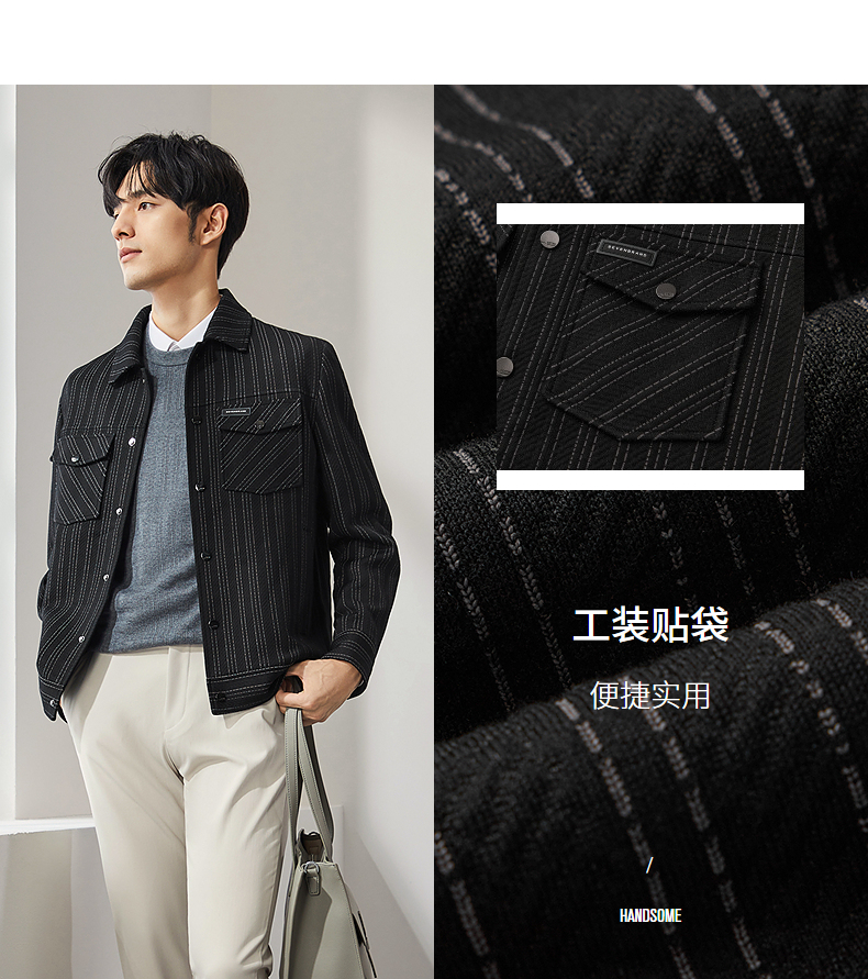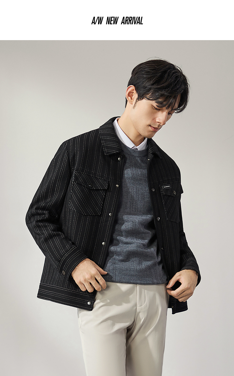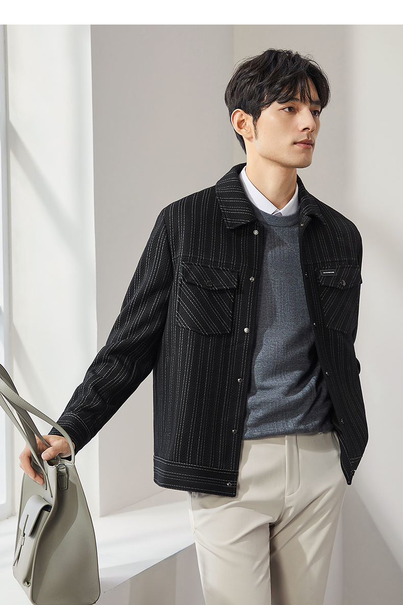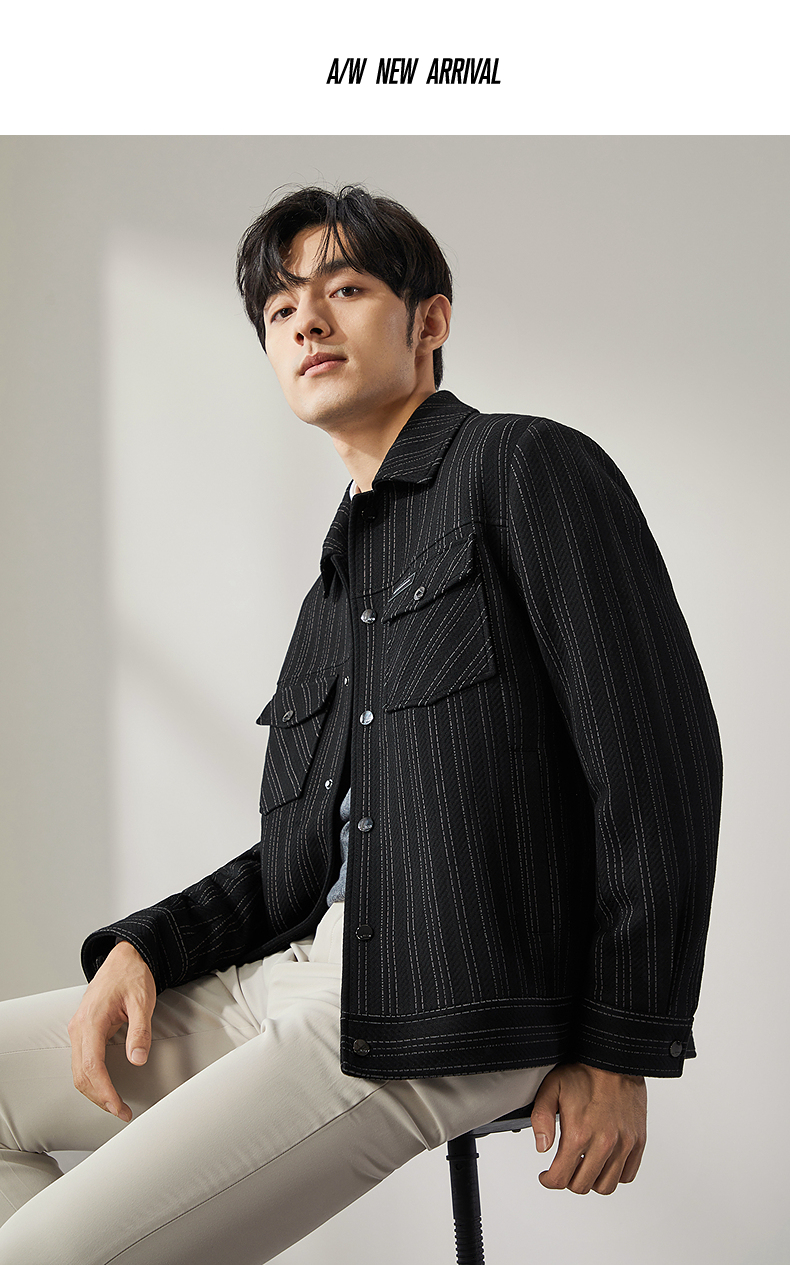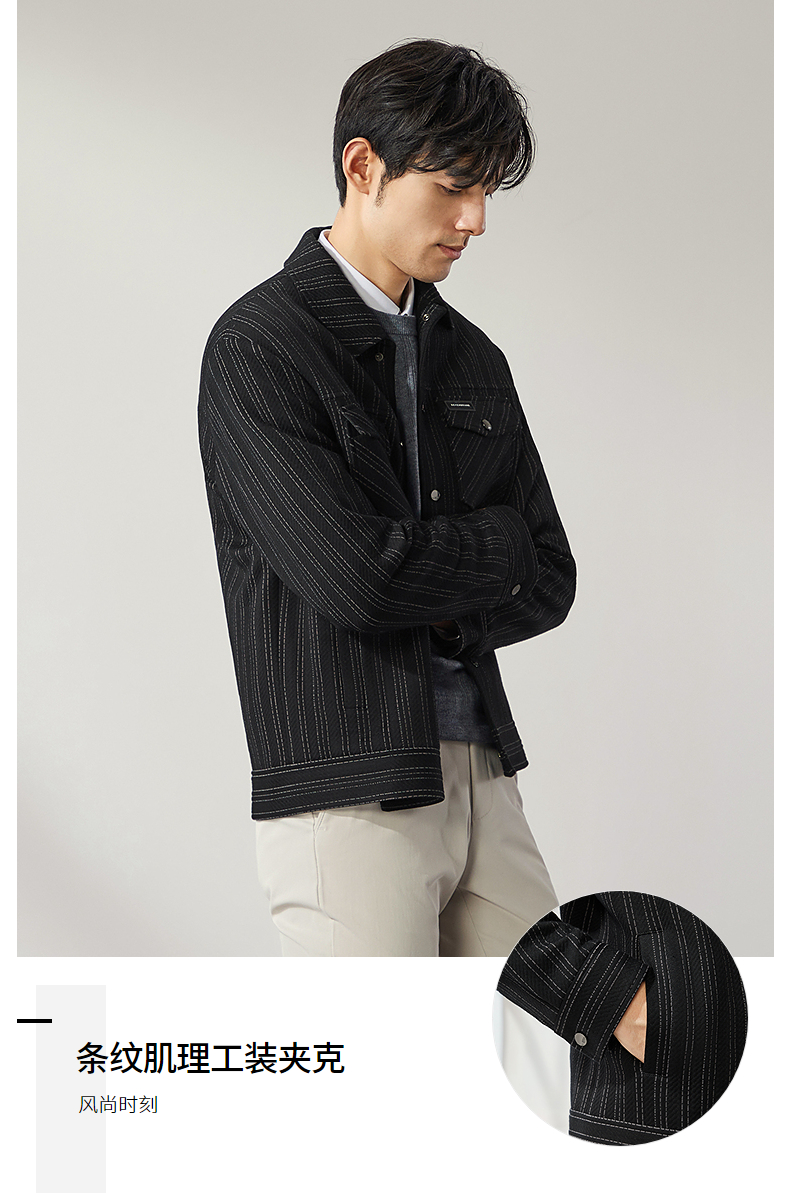柒牌男士翻领夹克秋冬2024新款时尚条纹提花工装风休闲茄克衫外套 127K70930