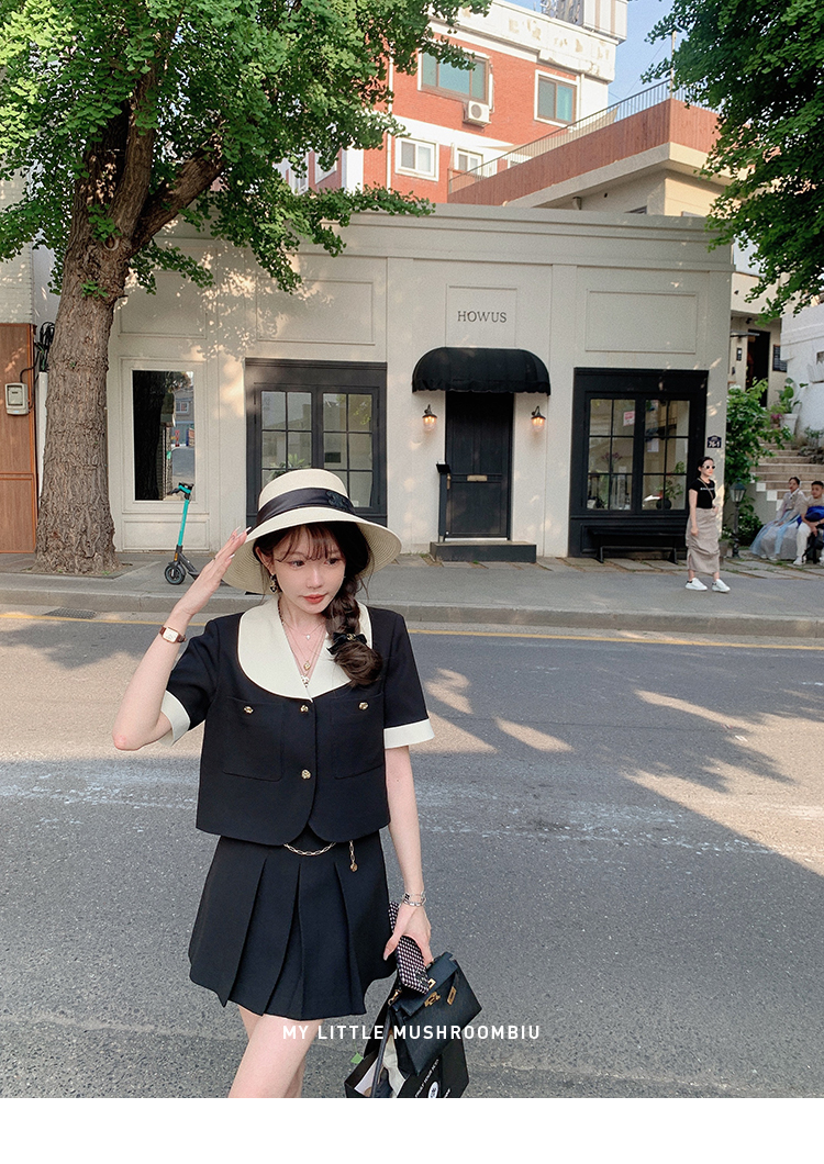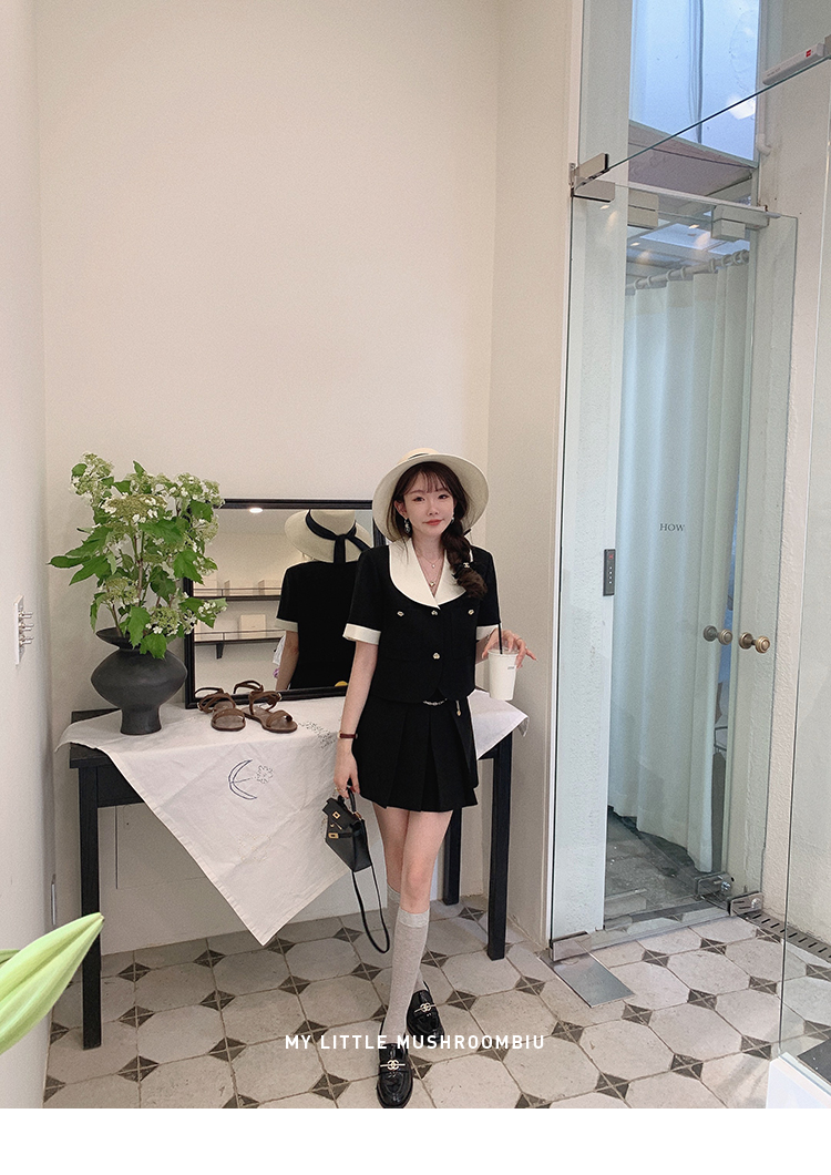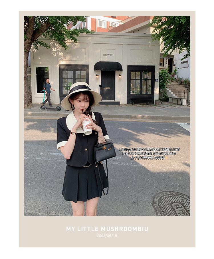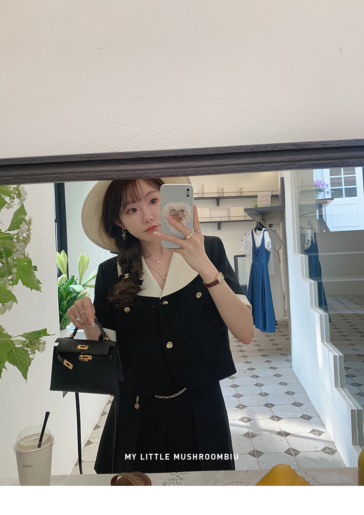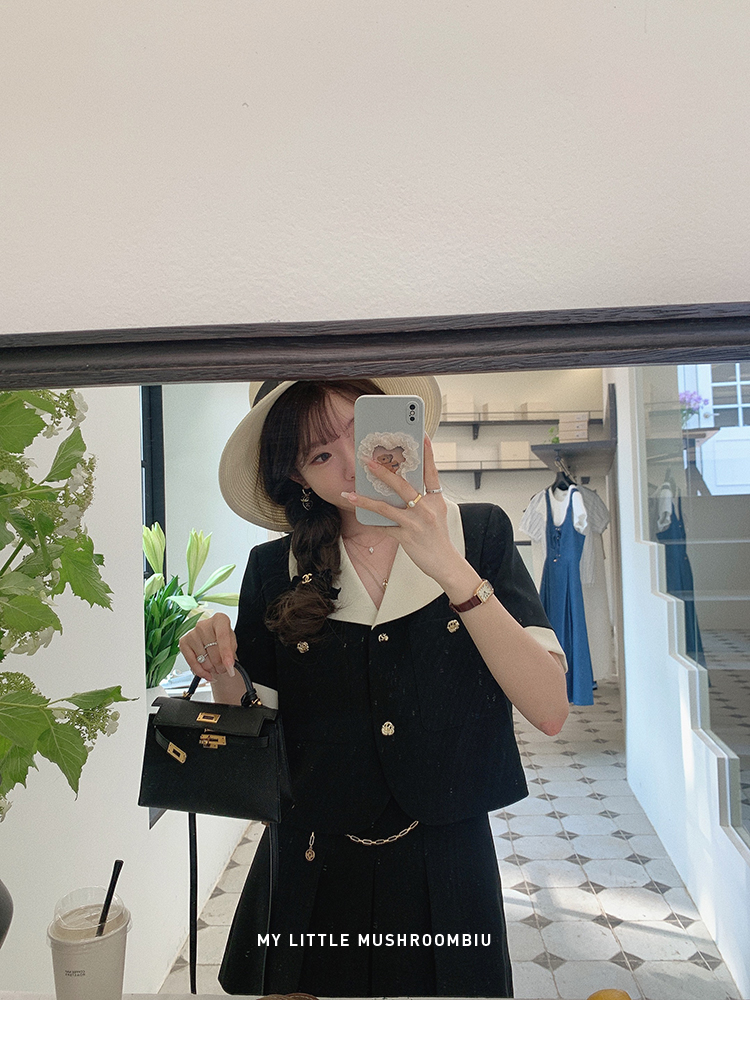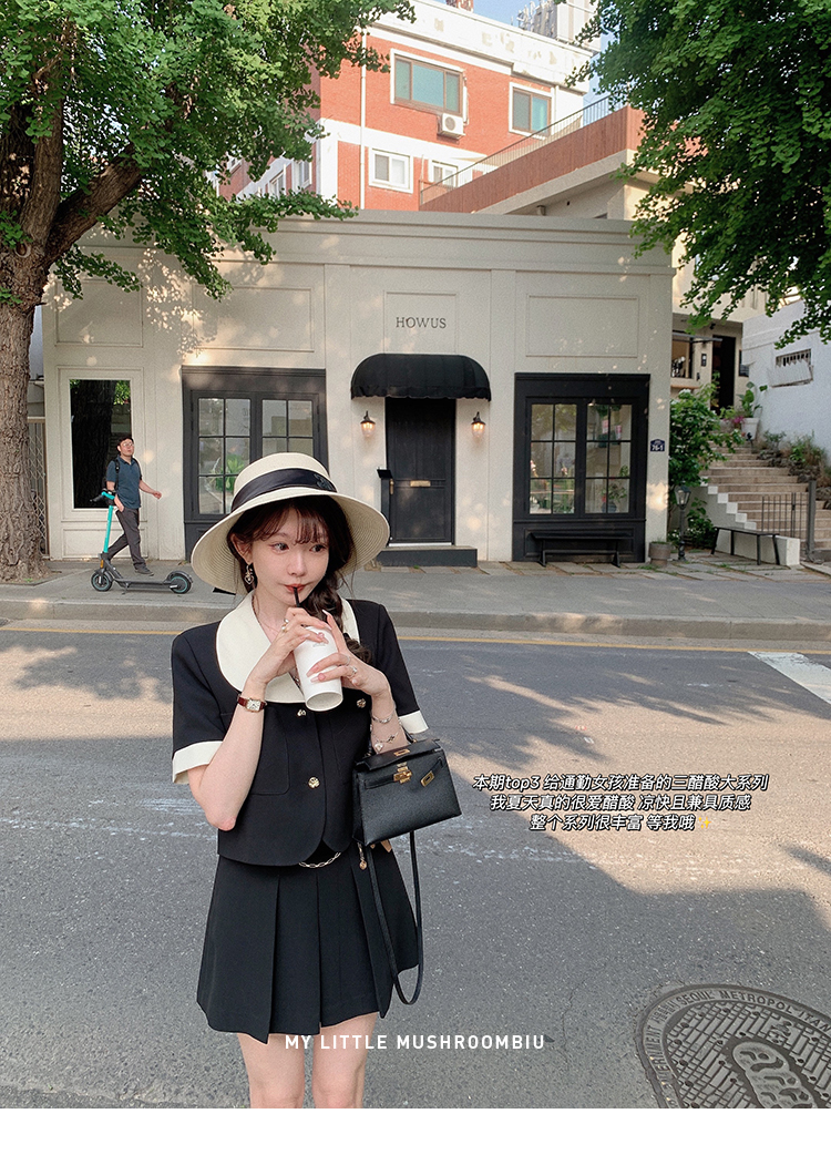 金蘑菇菇 招牌 都市感三醋酸系列/赫本黑色两件套装短袖西装裙子