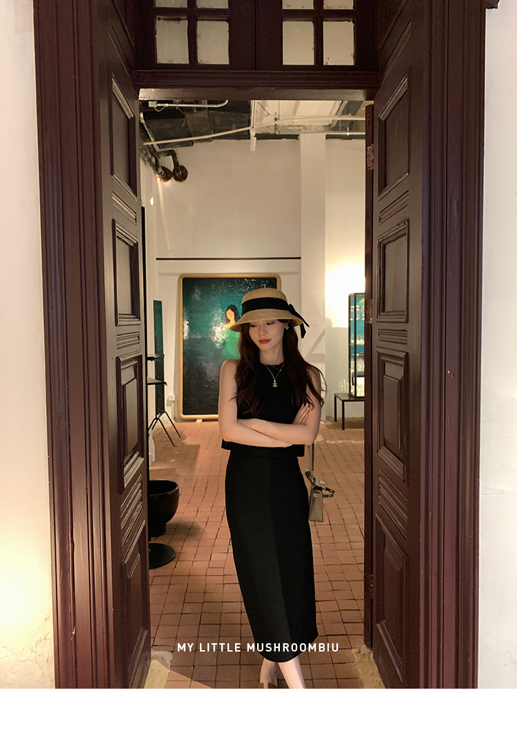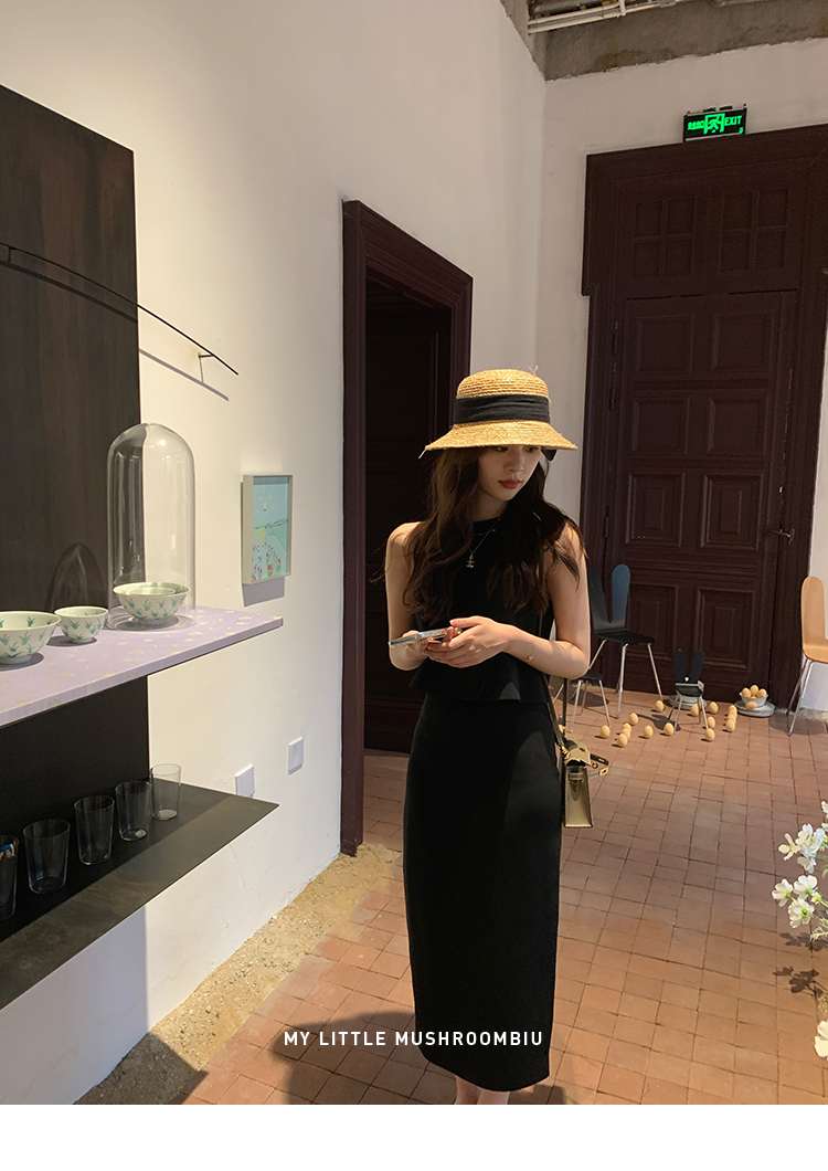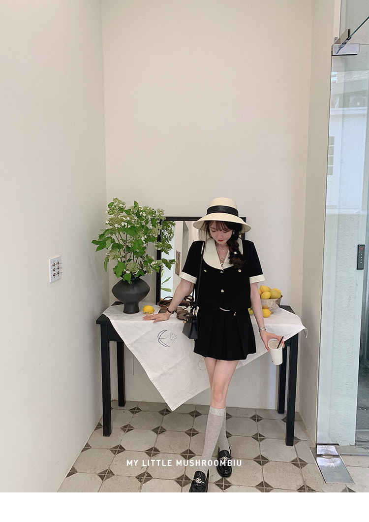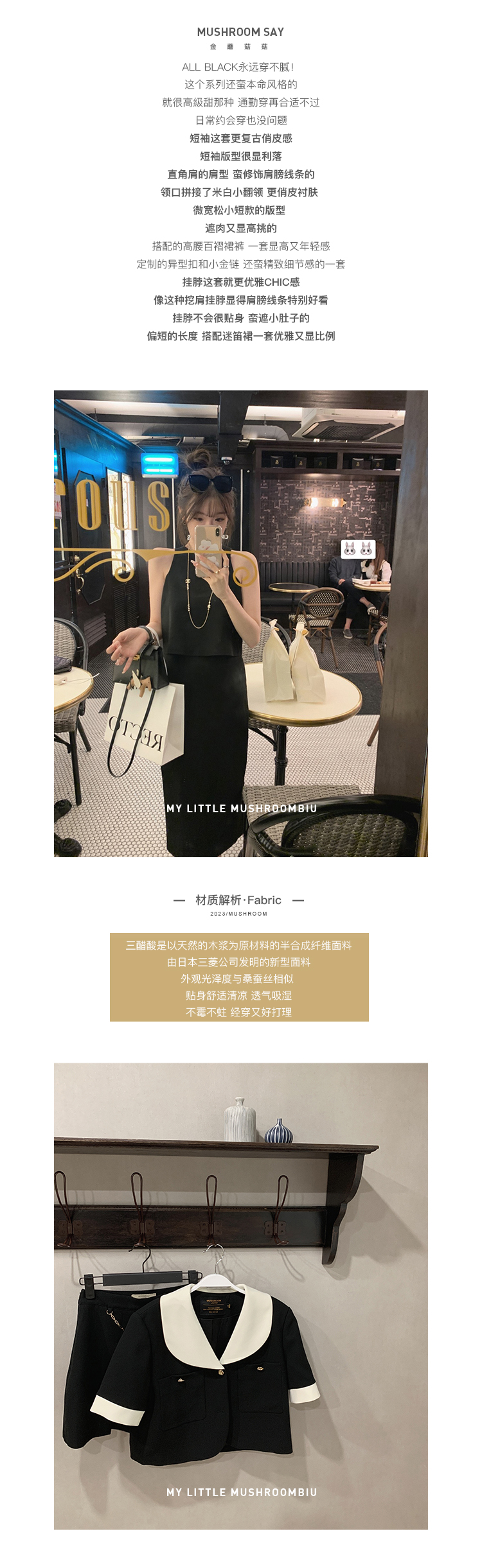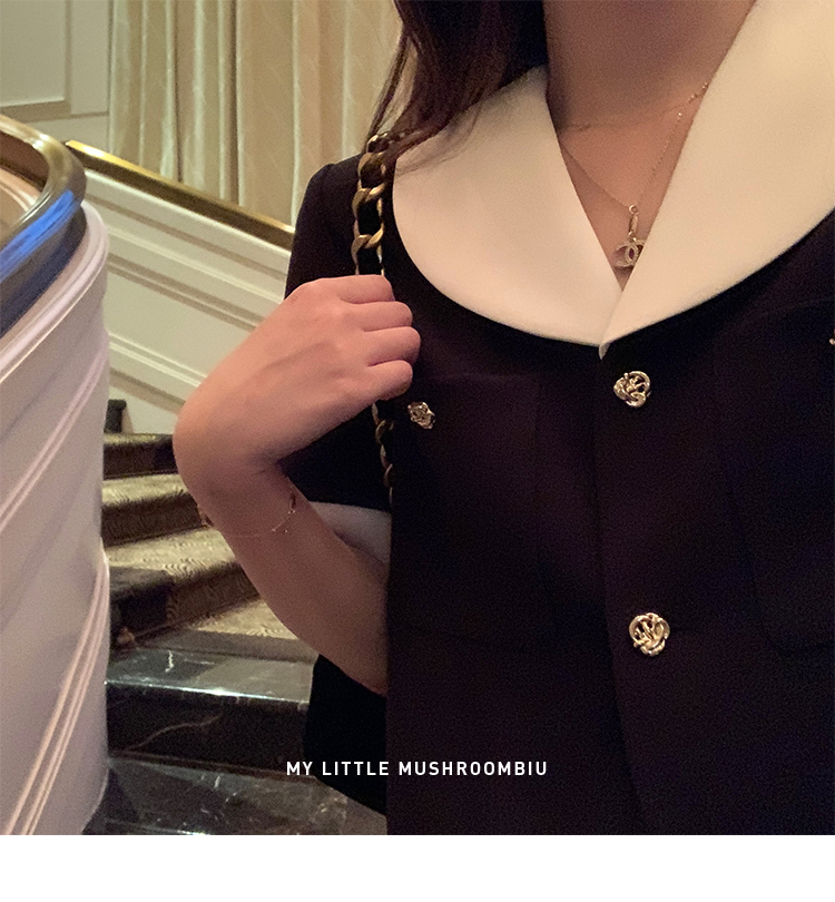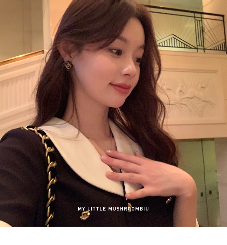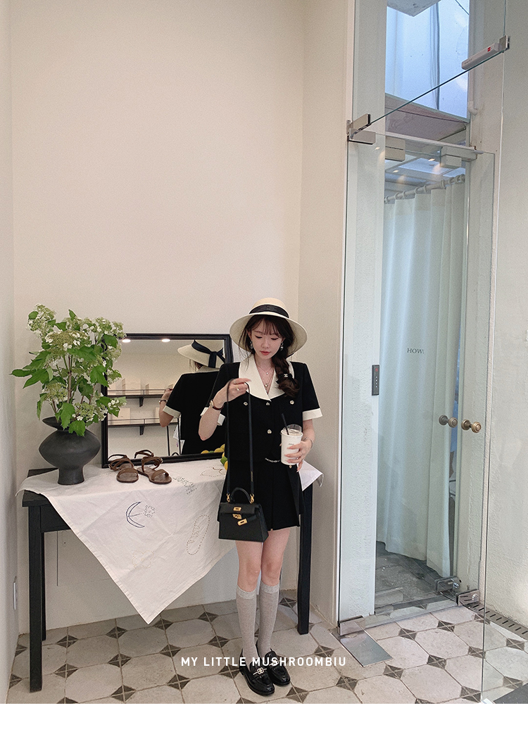 金蘑菇菇 招牌 都市感三醋酸系列/赫本黑色两件套装短袖西装裙子
