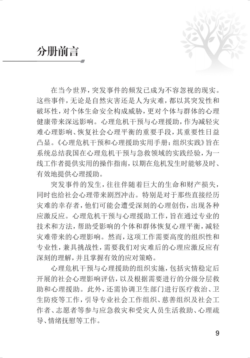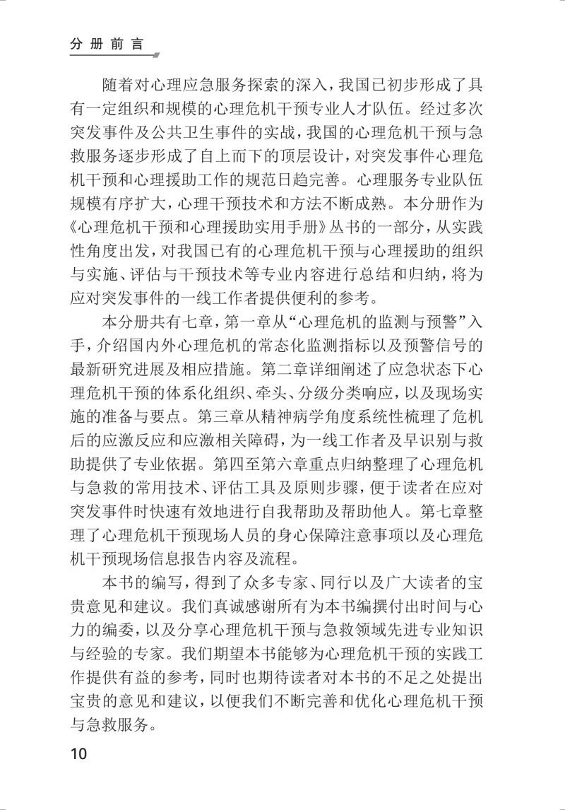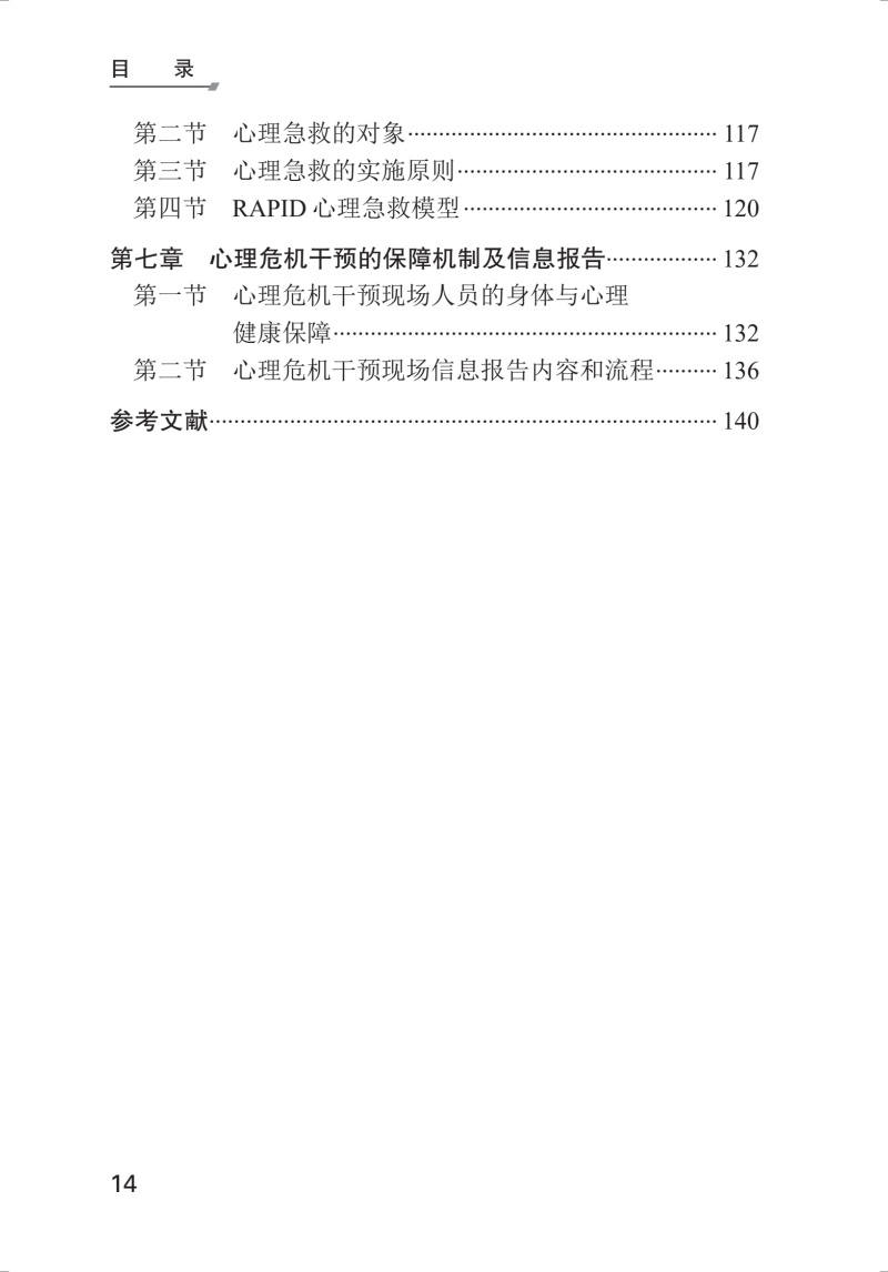 第一章 心理危机的监测与预警/ 1 第一节 机构常态化心理危机监测 / 1 第二节 心理危机响应机制 / 5 第二章 心理危机干预的组织和实施/ 9 第一节 心理危机干预的组织 / 9 第二节 心理危机干预的准备工作 / 19 第三节 心理危机干预的现场实施 / 26 第三章 危机后的常见精神卫生问题/ 35 第一节 危机后的常见精神障碍 / 35 第二节 危机后应激相关障碍的识别与诊断 / 43 第四章 心理危机干预的常用技术/ 54 第一节 创伤聚焦认知行为疗法 / 54 第二节 眼动脱敏与再加工治疗 / 58 第三节 焦点解决治疗 / 67 第四节 其他常用技术 / 70 第五章 心理危机干预的常用评估工具/ 73 第一节 危机现场评估 / 73 第二节 心理危机干预常用评估量表 / 90 第三节 其他身心检测工具 / 112 第六章 心理急救干预/ 115 第一节 心理急救的概念 / 115 第二节 心理急救的对象 /117 第三节 心理急救的实施原则 /117 第四节 RAPID心理急救模型 /120 第七章 心理危机干预的保障机制及信息报告/132 第一节 心理危机干预现场人员的身体与心理健康保障 /132 第二节 心理危机干预现场信息报告内容和流程 /136 参考文献/140