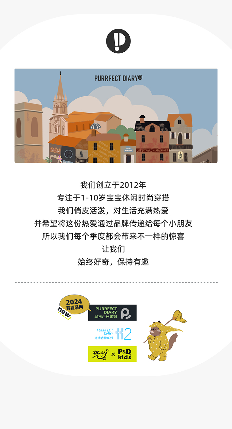- Purrfect-Diary专注于贴近自然随性的穿着概念,轻奢平价的童装文化传播,在产品设计上更加注重婴童穿着的舒适性、安全性、更出众的国际化品牌,将欧美的育婴文化在中国进行深入的传播与推广。
