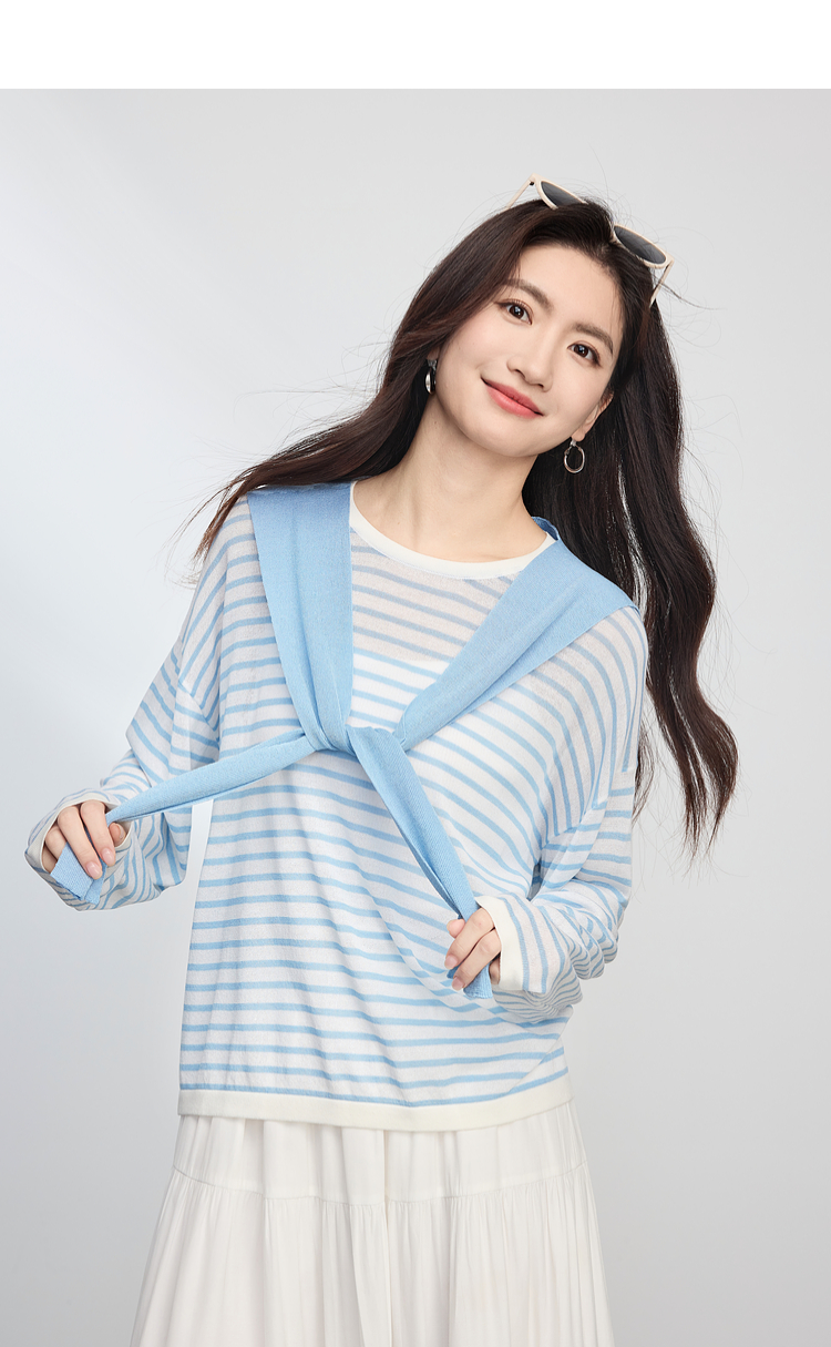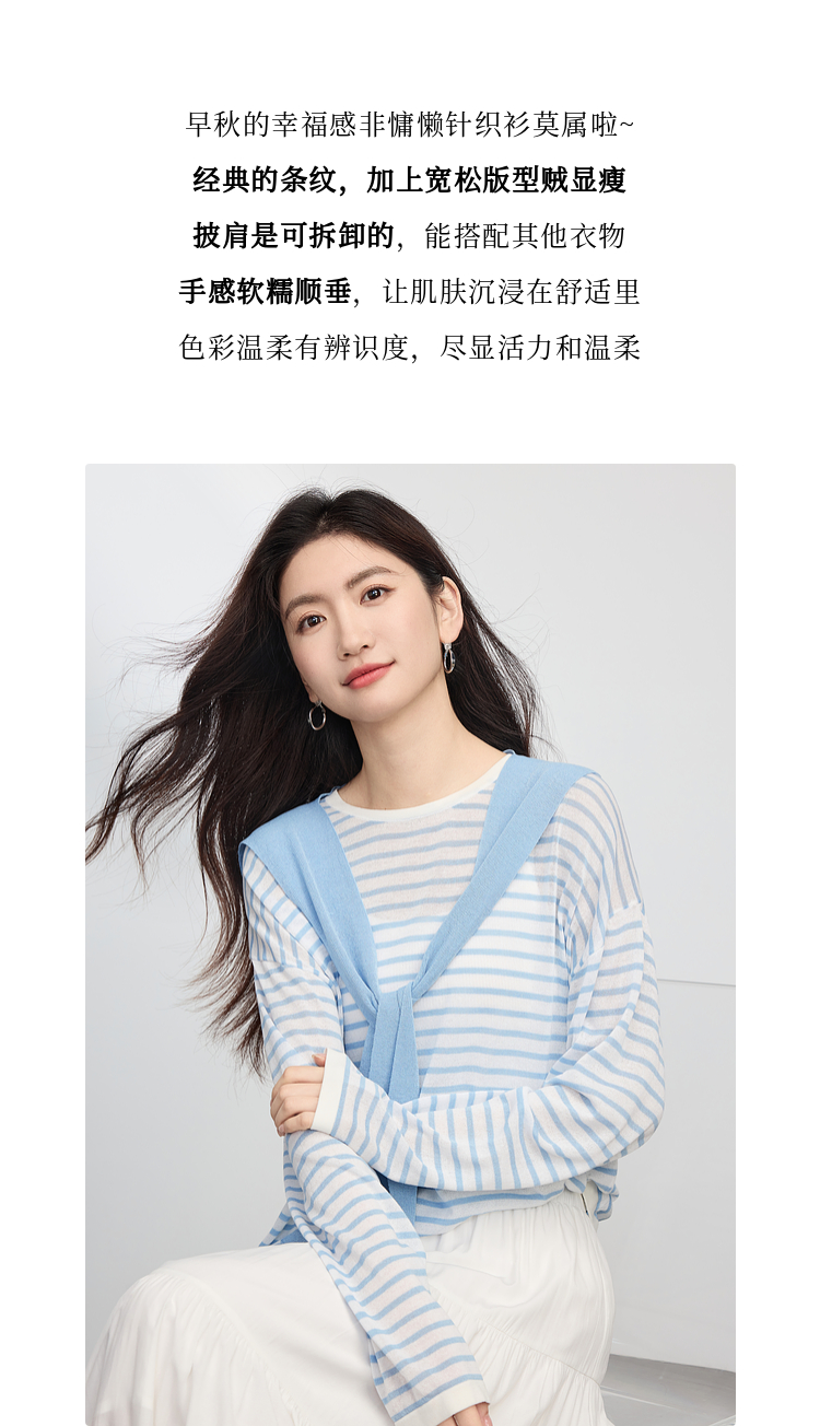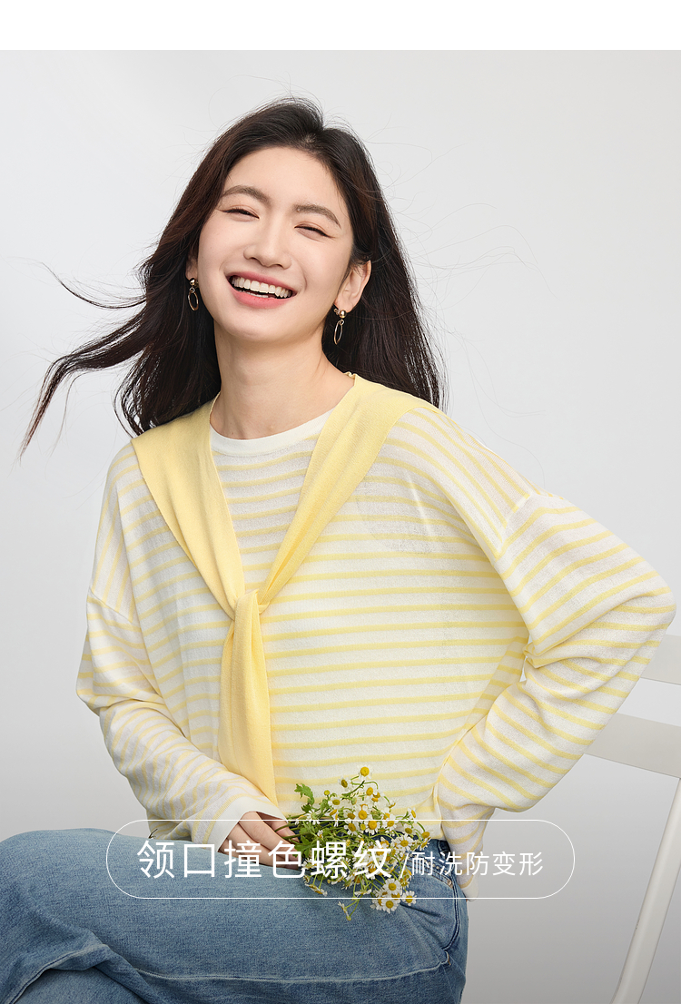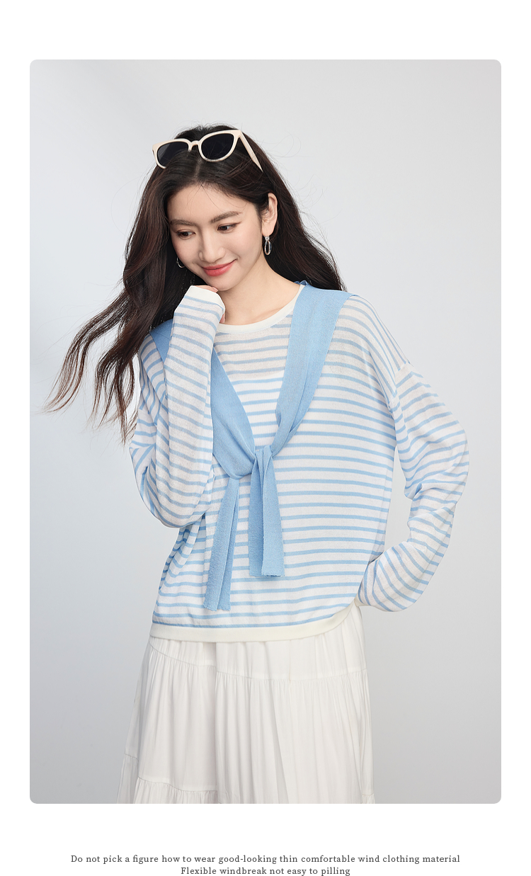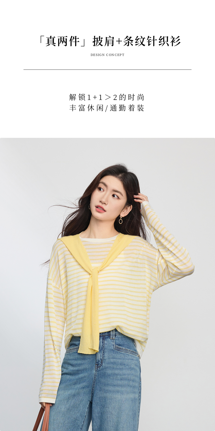【08/12新品】熙世界披肩条纹针织衫两件套女夏秋新款宽松慵懒风长袖罩衫上衣