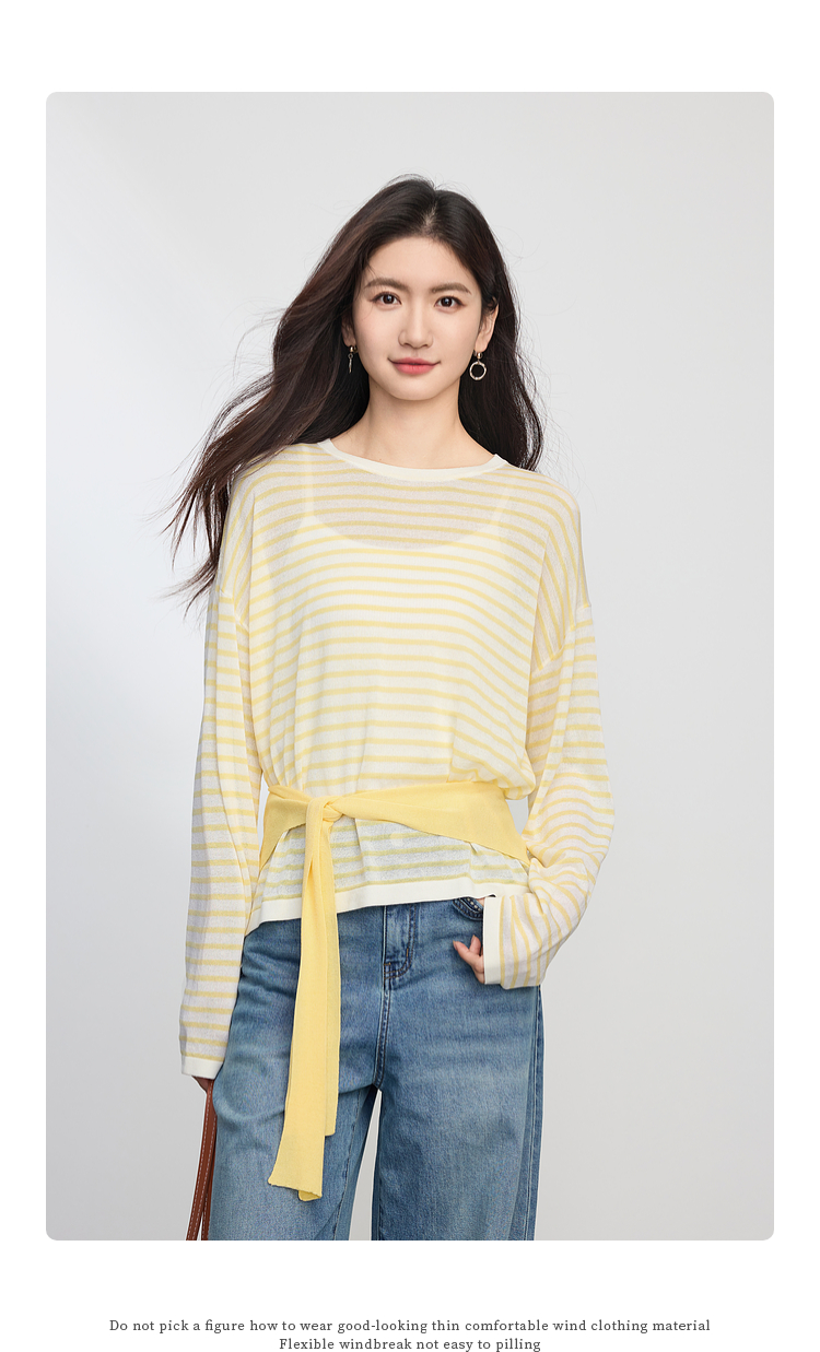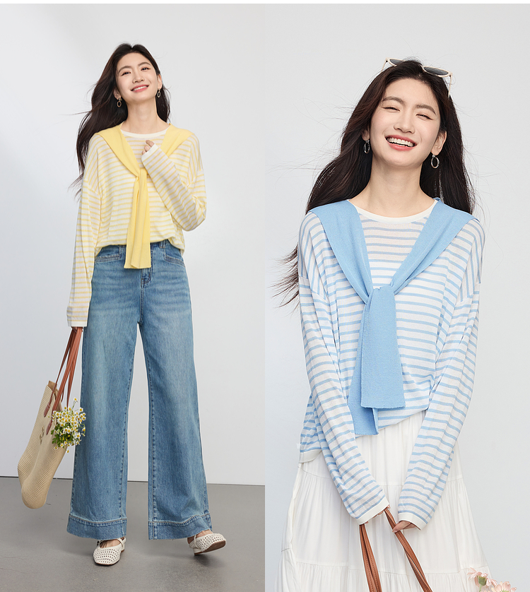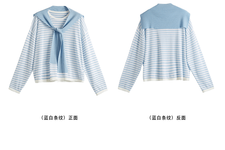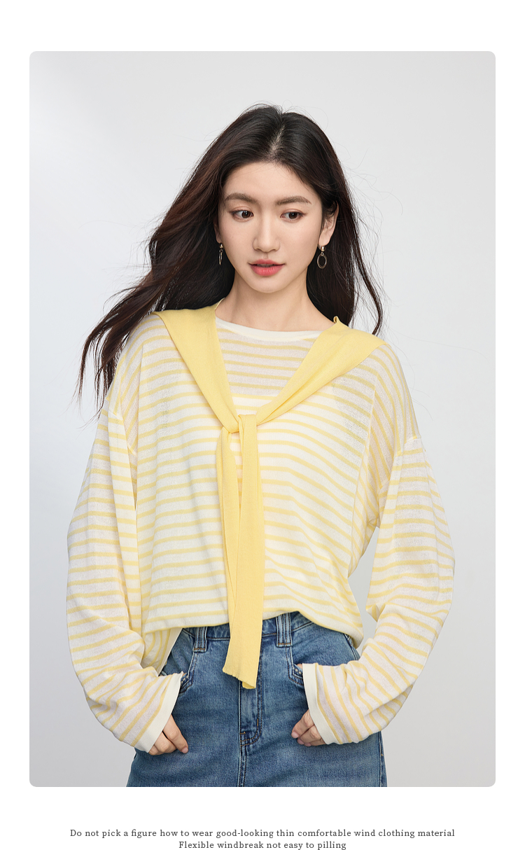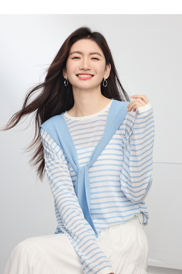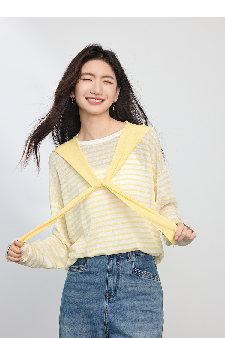 【08/12新品】熙世界披肩条纹针织衫两件套女夏秋新款宽松慵懒风长袖罩衫上衣