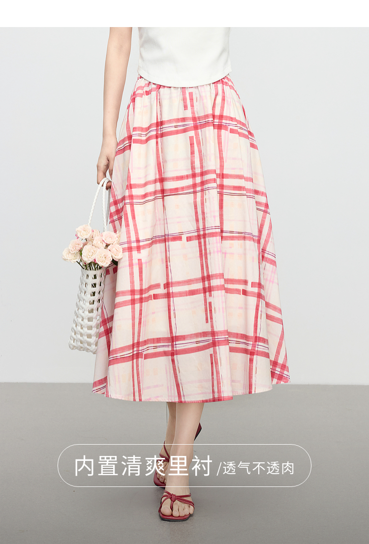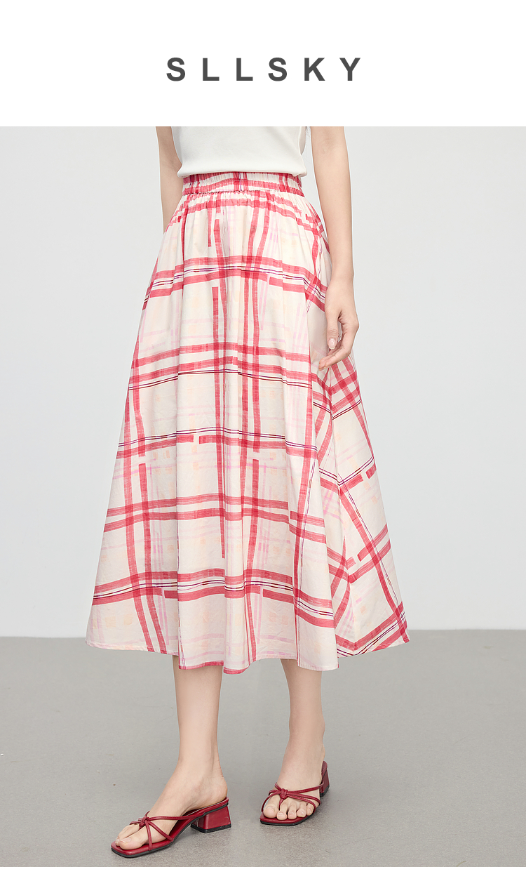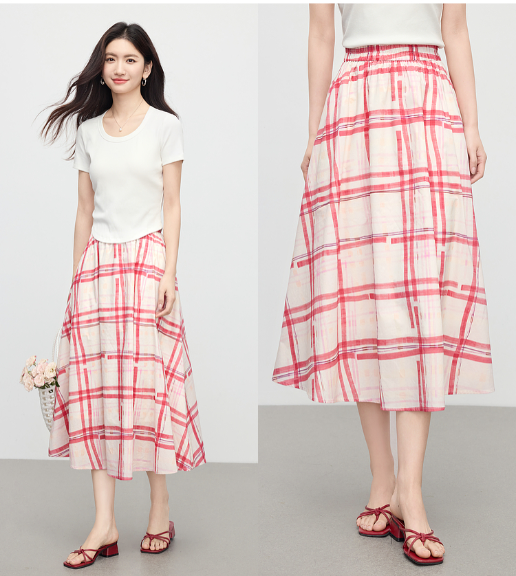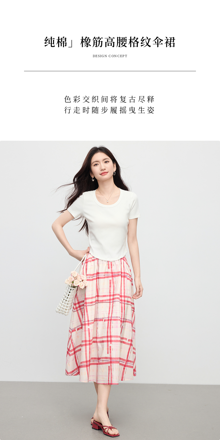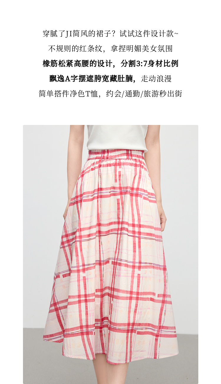 【07/23新品】熙世界气质红色格纹半身裙女夏季新品小个子松紧高腰显瘦a字伞裙