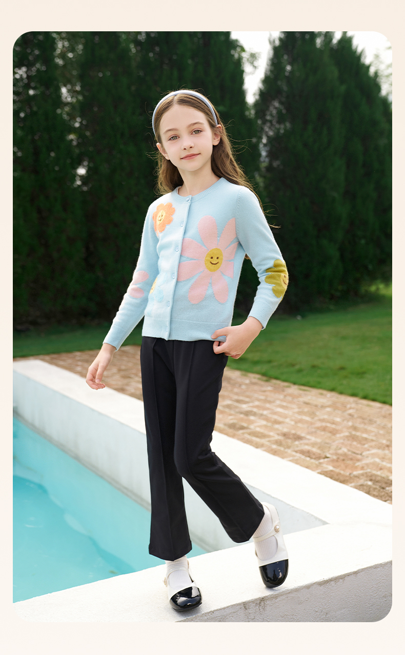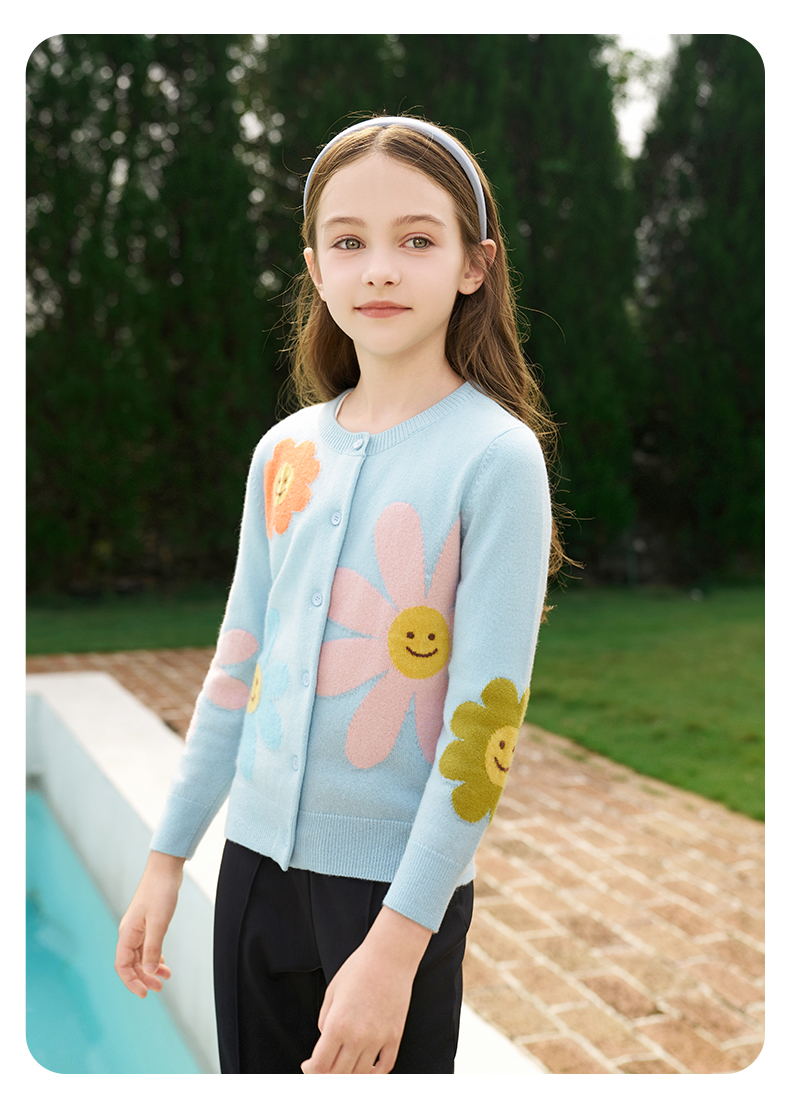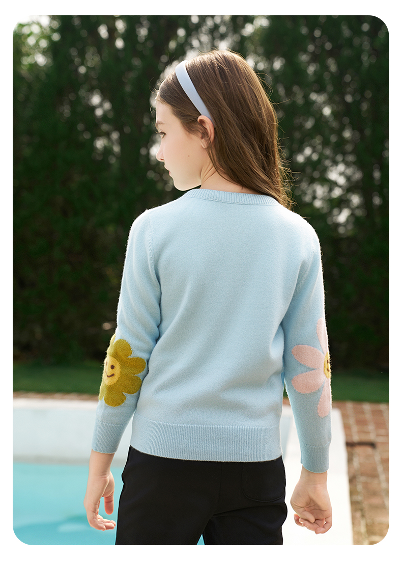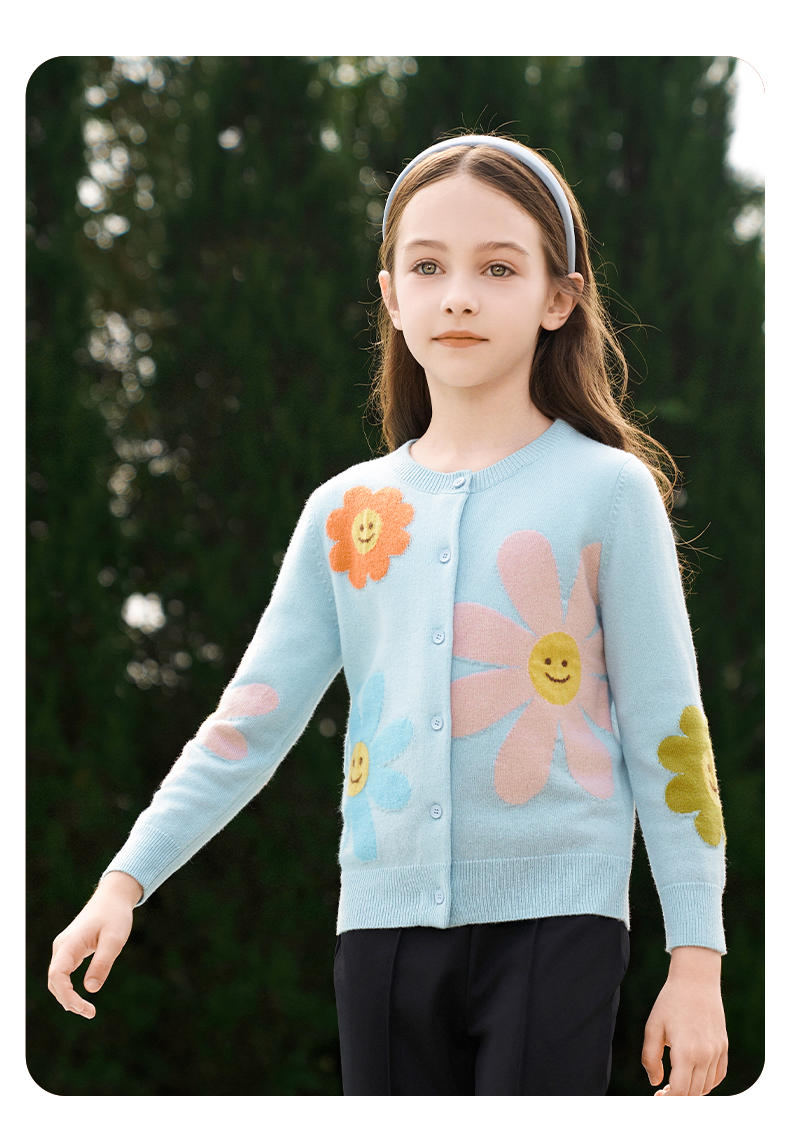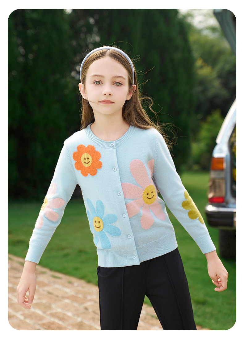 mettekids女童羊绒开衫秋冬新款花朵款毛衣儿童浅蓝休闲针织开衫