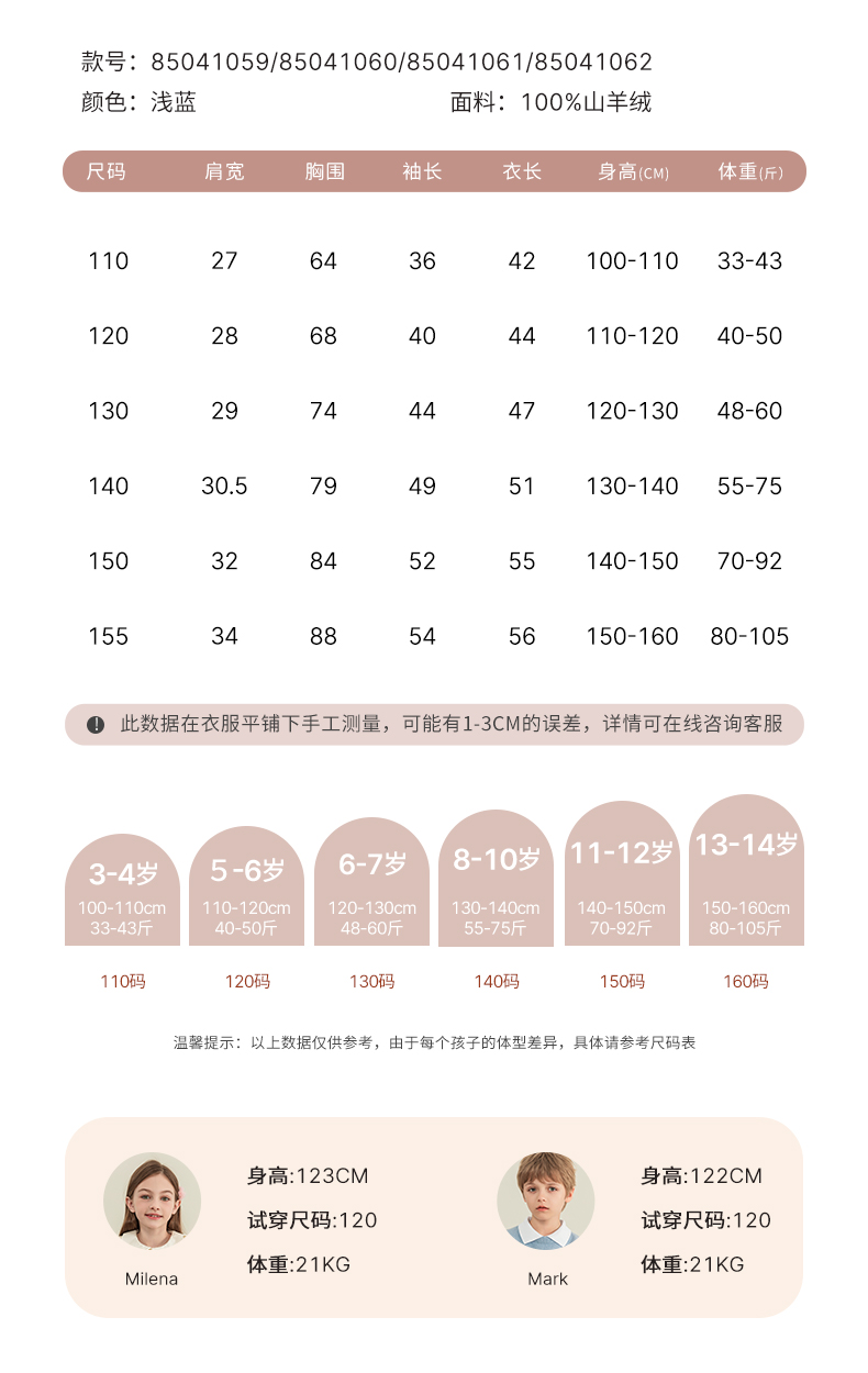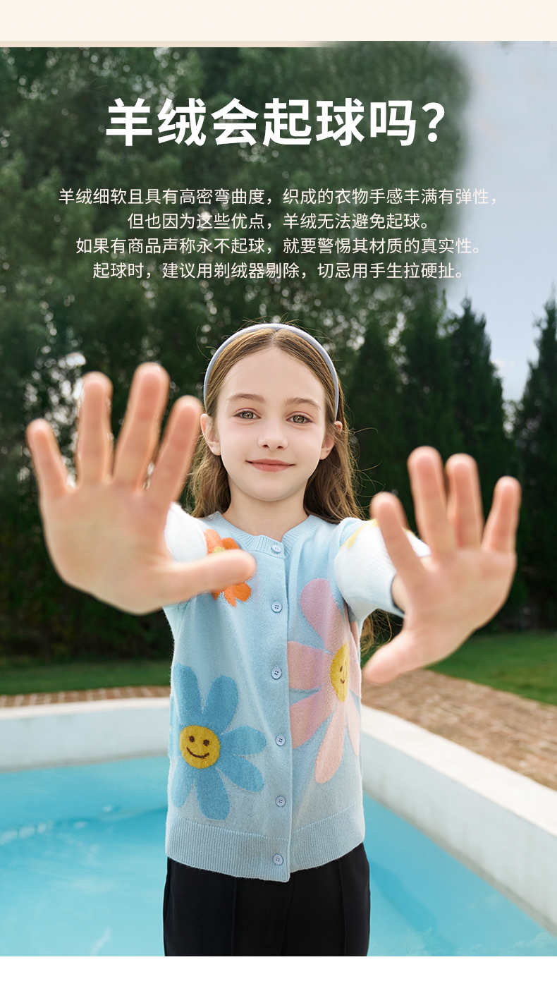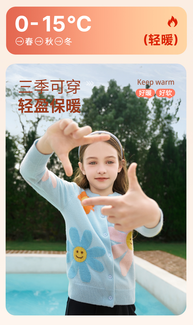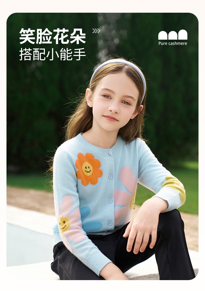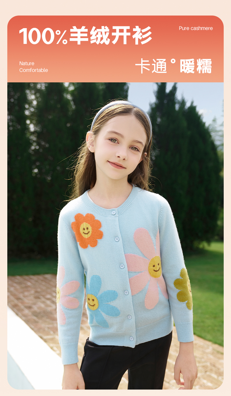 mettekids女童羊绒开衫秋冬新款花朵款毛衣儿童浅蓝休闲针织开衫