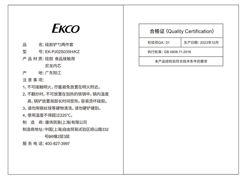 【分仓直发包邮】康宁EKCO硅胶铲勺两件套EK-PJ02S035H/KZ