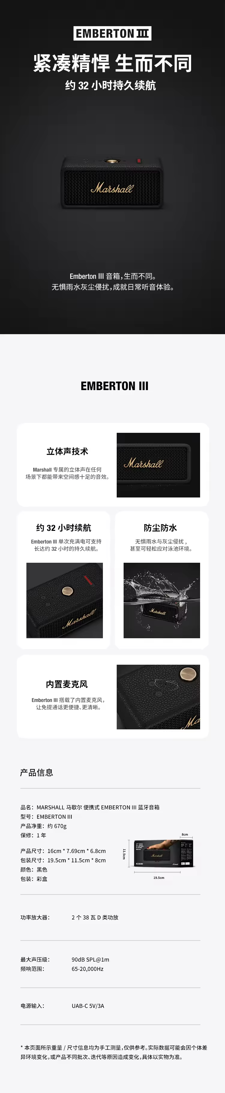 MARSHALL马歇尔 便携式 EMBERTON III 蓝牙音箱