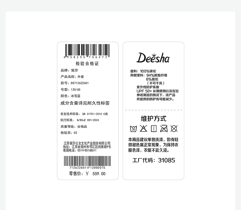 笛莎Deesha 2026年夏季新款中童女童防晒衣外套
