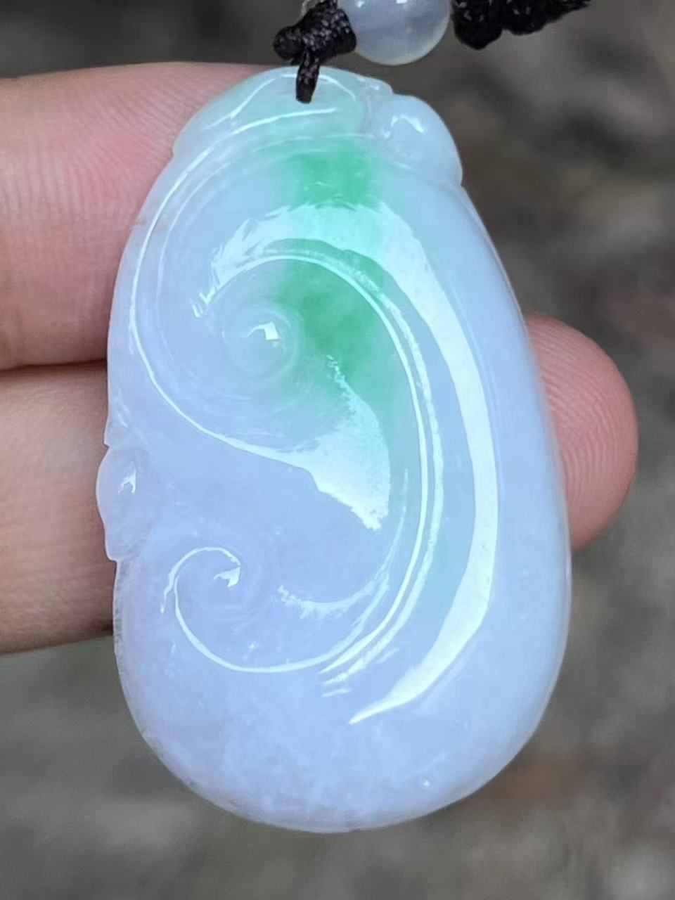 这一手是白底青的料子,也是我们几千件翡翠中唯一的欧白底青。白底青是一种以白色为底色,带有绿色的翡翠。千金难买一抹绿,白底青要的就是这一抹绿,非常吸睛~