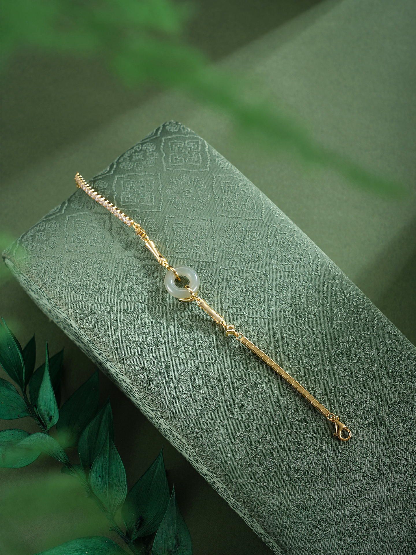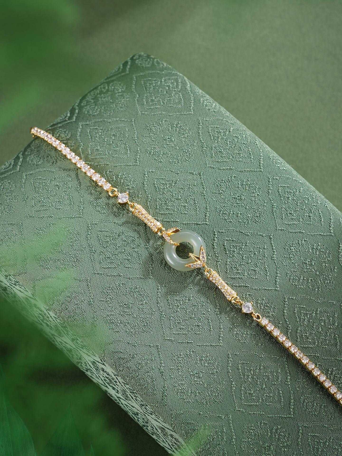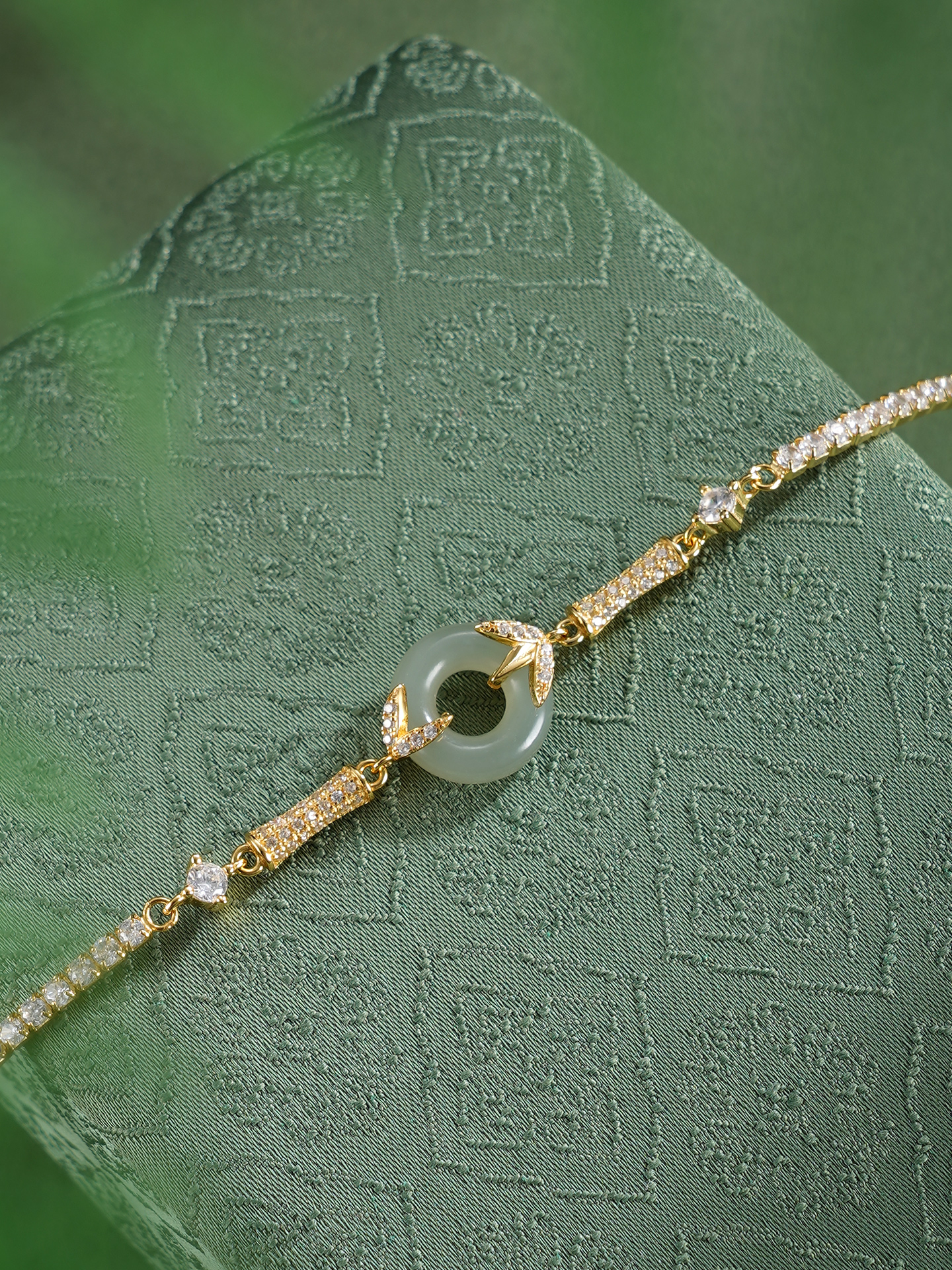 【寓意】:手链以平安扣为灵感设计,竹叶元素与平安扣相结合,寓意“竹福”绵长,平安相扣,光彩照人。