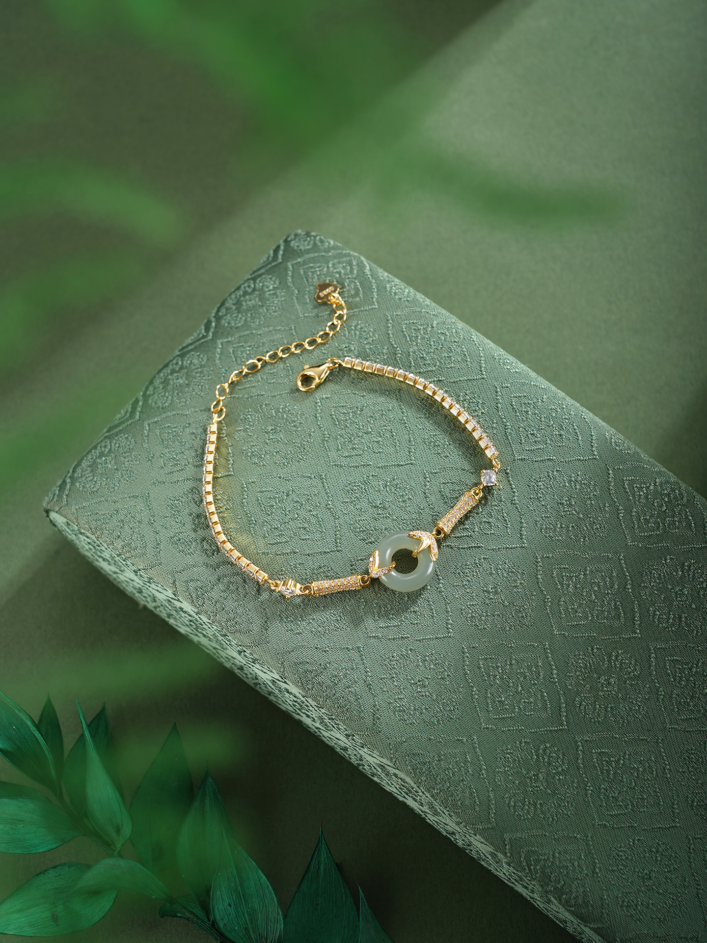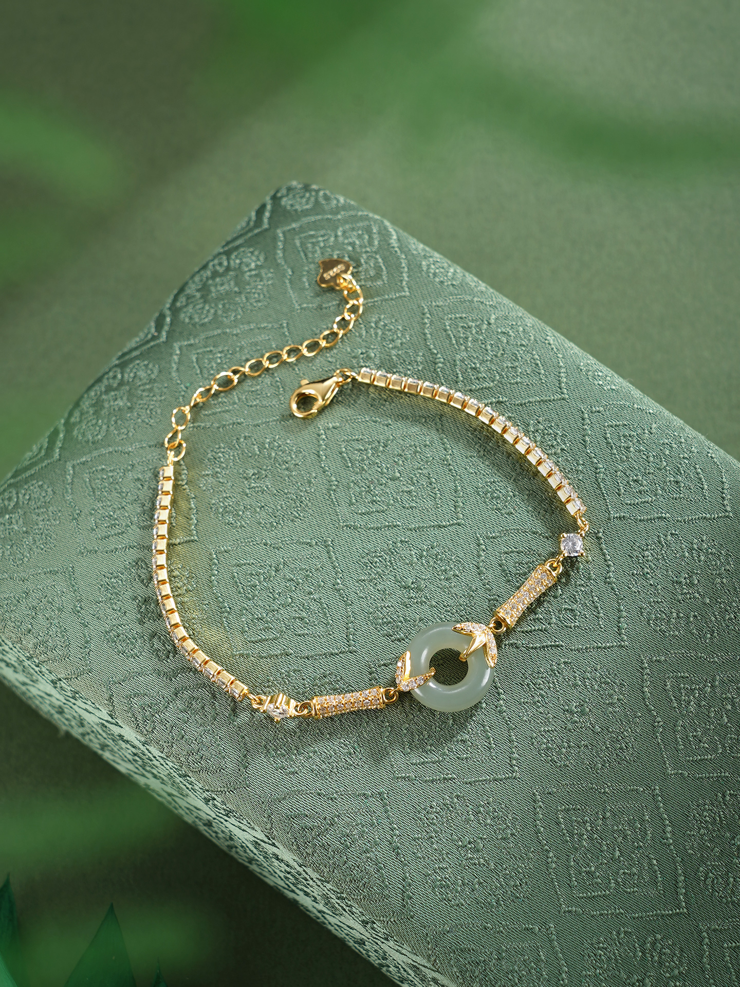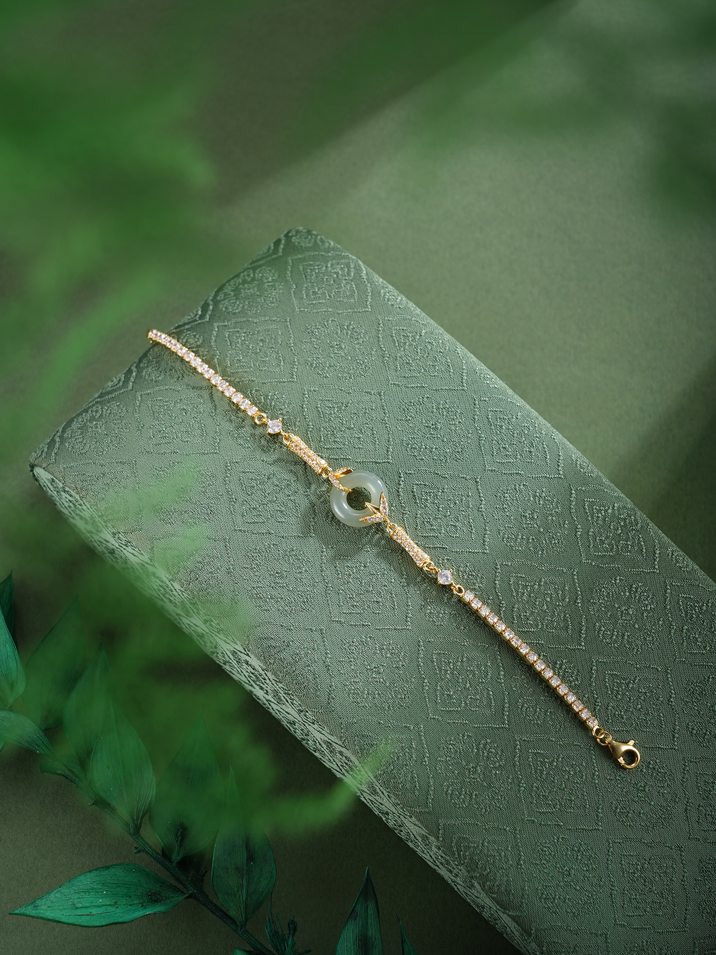 【寓意】:手链以平安扣为灵感设计,竹叶元素与平安扣相结合,寓意“竹福”绵长,平安相扣,光彩照人。