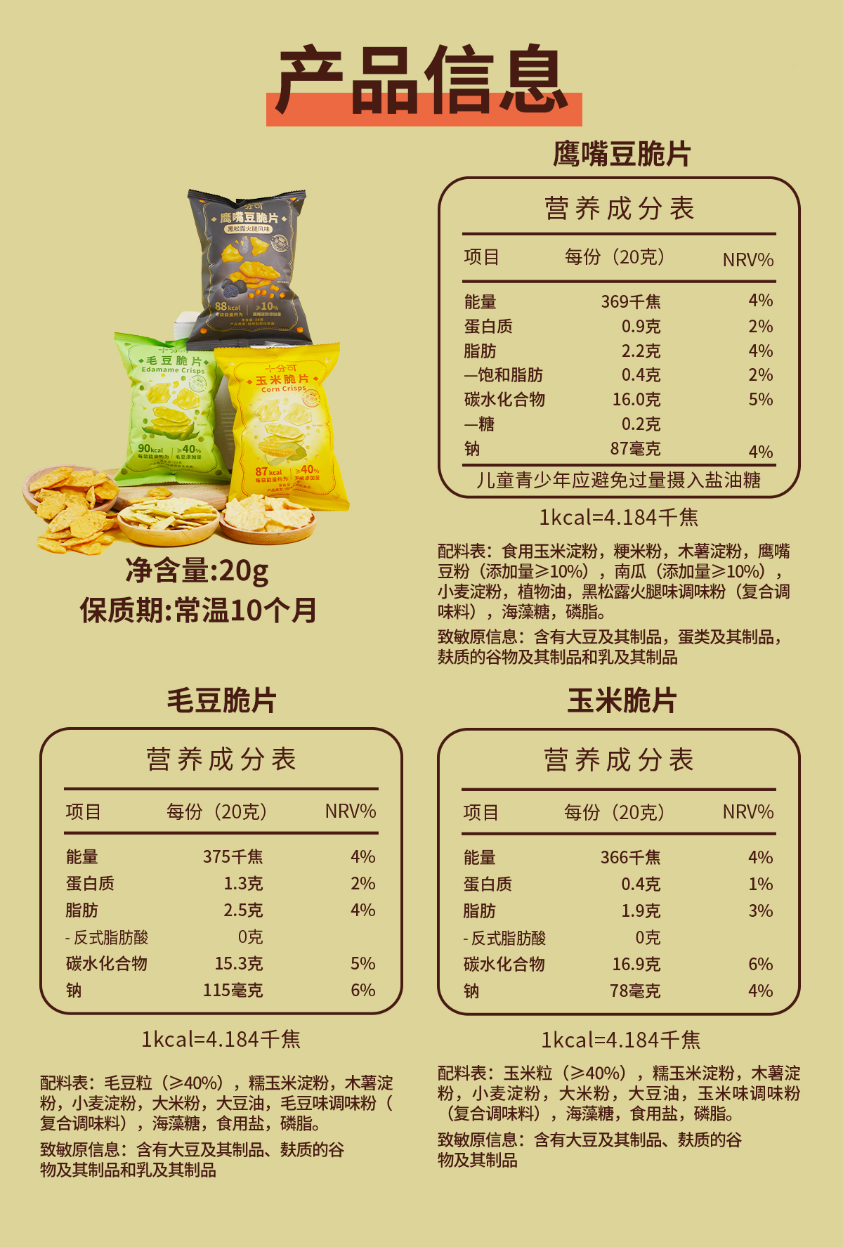 品牌直发 十分可 毛豆脆片/玉米脆片/鹰嘴豆脆片 20g/包 x4 / x8