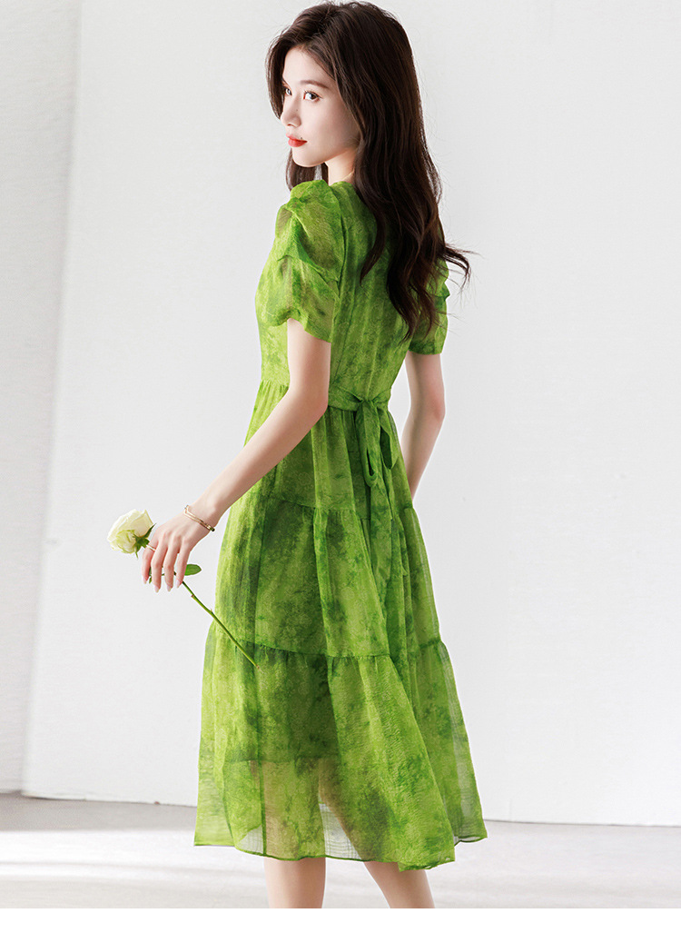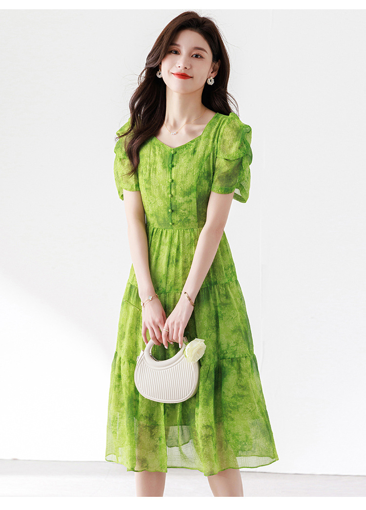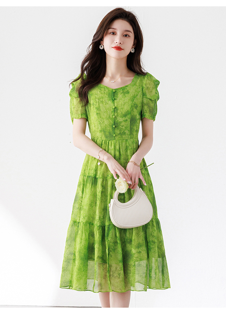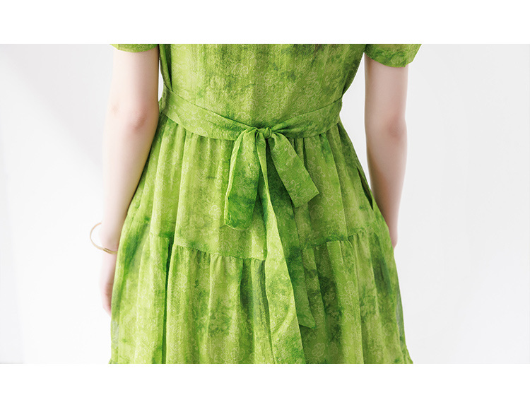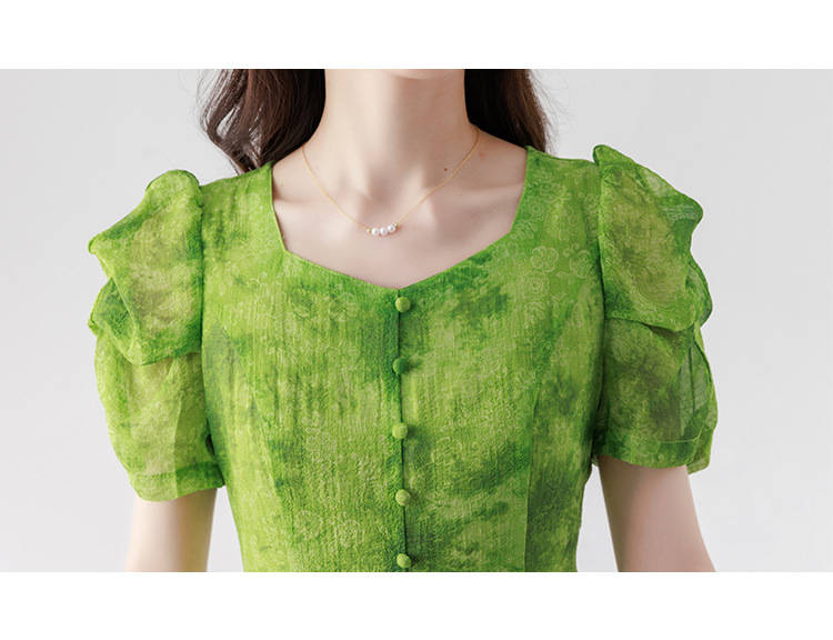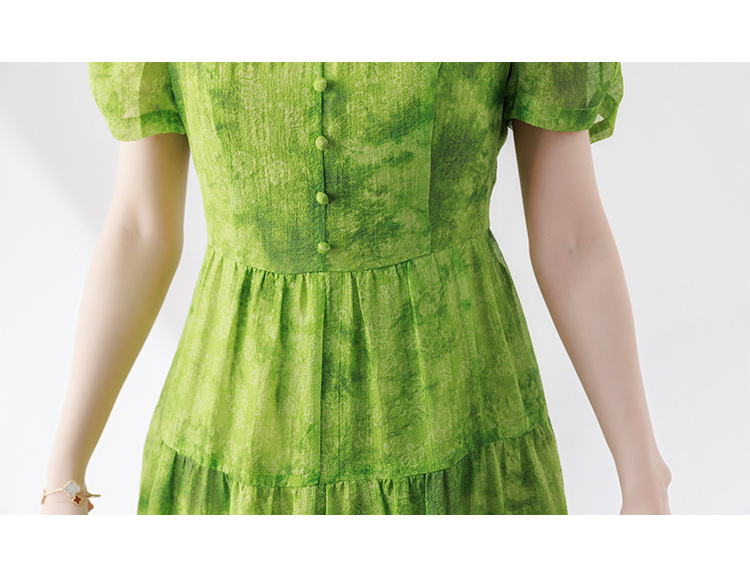 夏季新款,短袖裙气质优雅中长款高腰A字裙绿色印花连衣裙QYM-TB-CY0930-Y