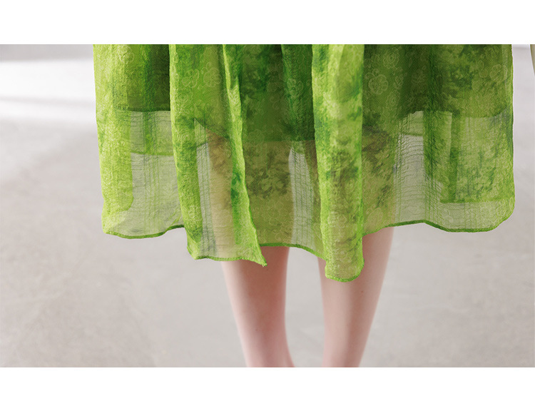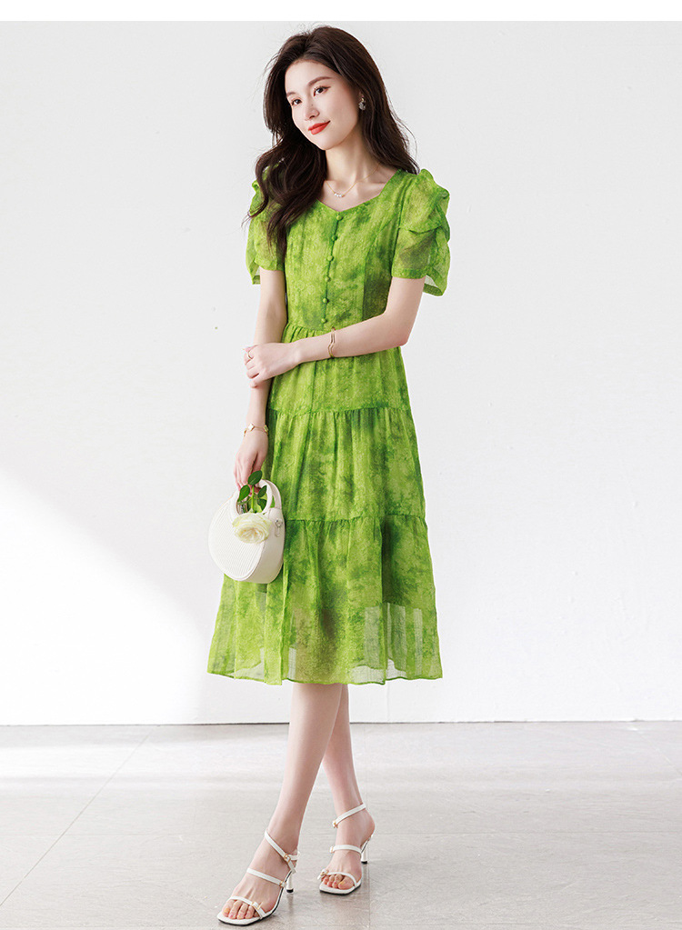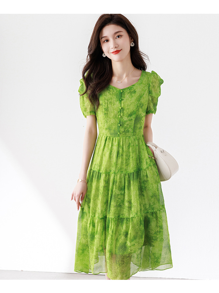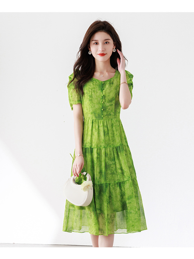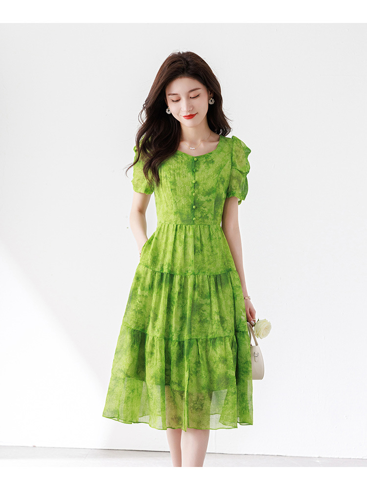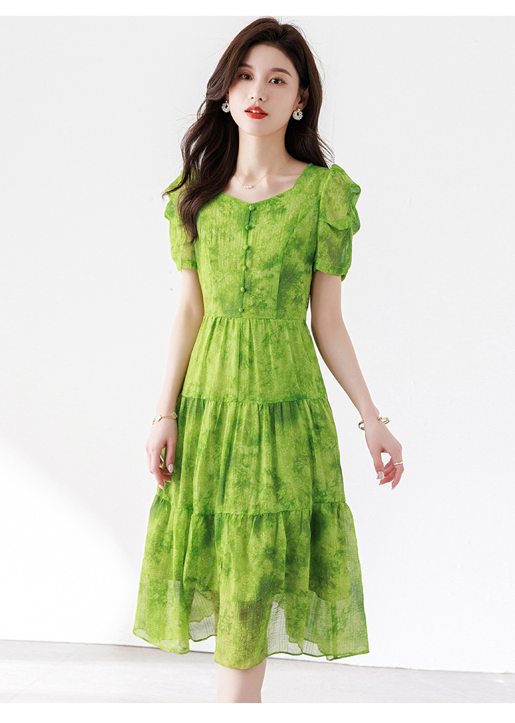夏季新款,短袖裙气质优雅中长款高腰A字裙绿色印花连衣裙QYM-TB-CY0930-Y