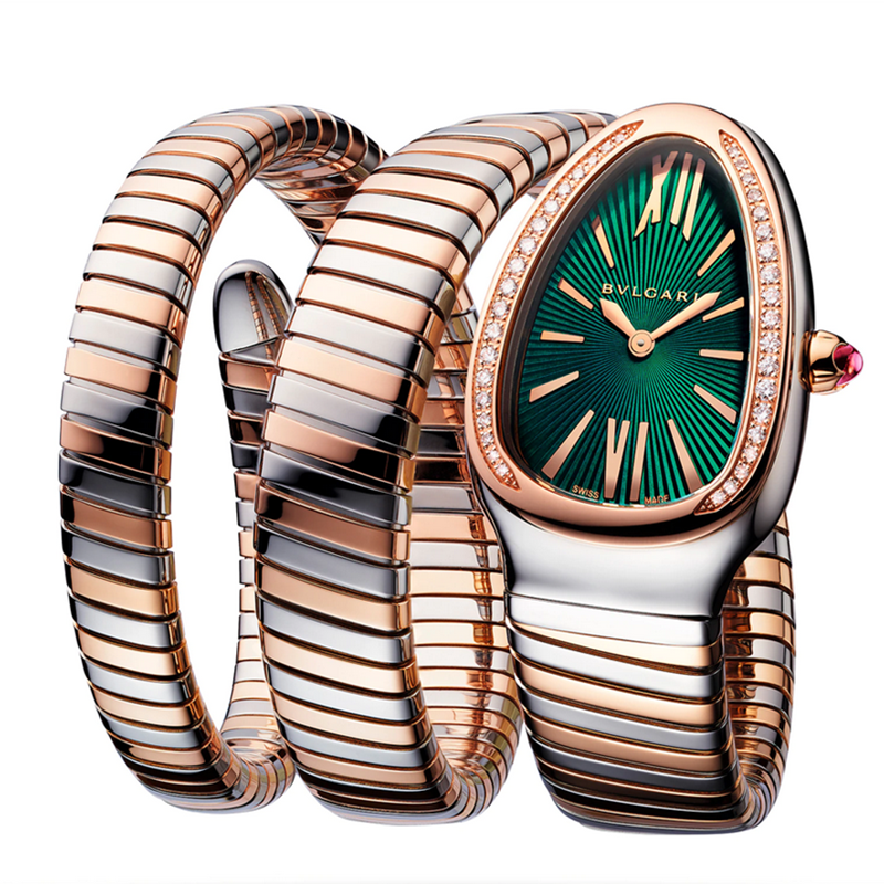镜面 材质 | 蓝宝石水晶玻璃 | 表盘 | 18K玫瑰金精钢表壳 绿色表盘 表圈镶钻 精钢表冠镶嵌一颗凸形蛋面切割粉色红碧玺 密底 |