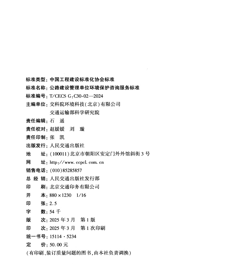 书名:公路建设管理单位环境保护咨询服务标准(T/CECS G:C30-02—2024)
