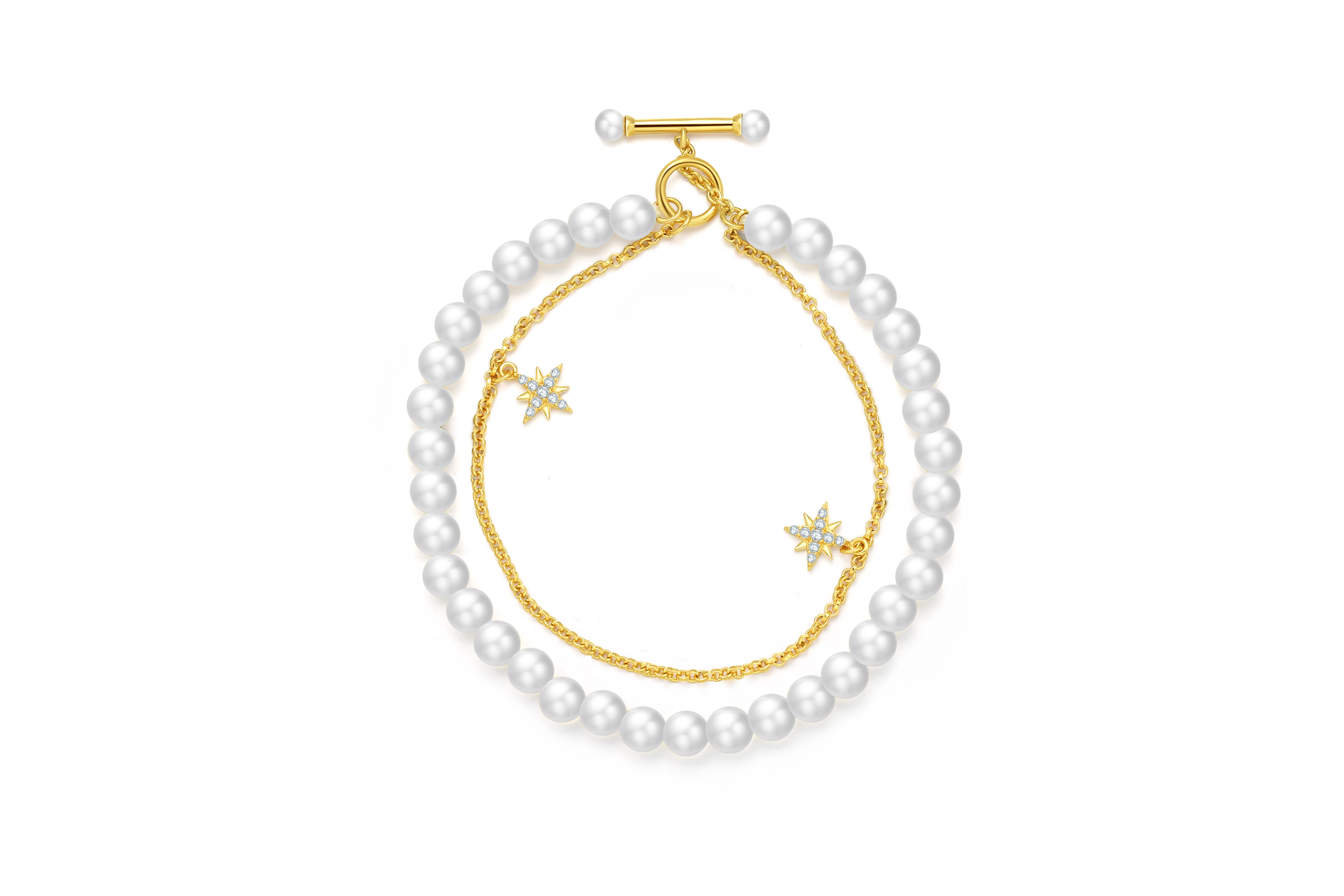 材质:925银镀18K金镶嵌贝珠、5A级锆石