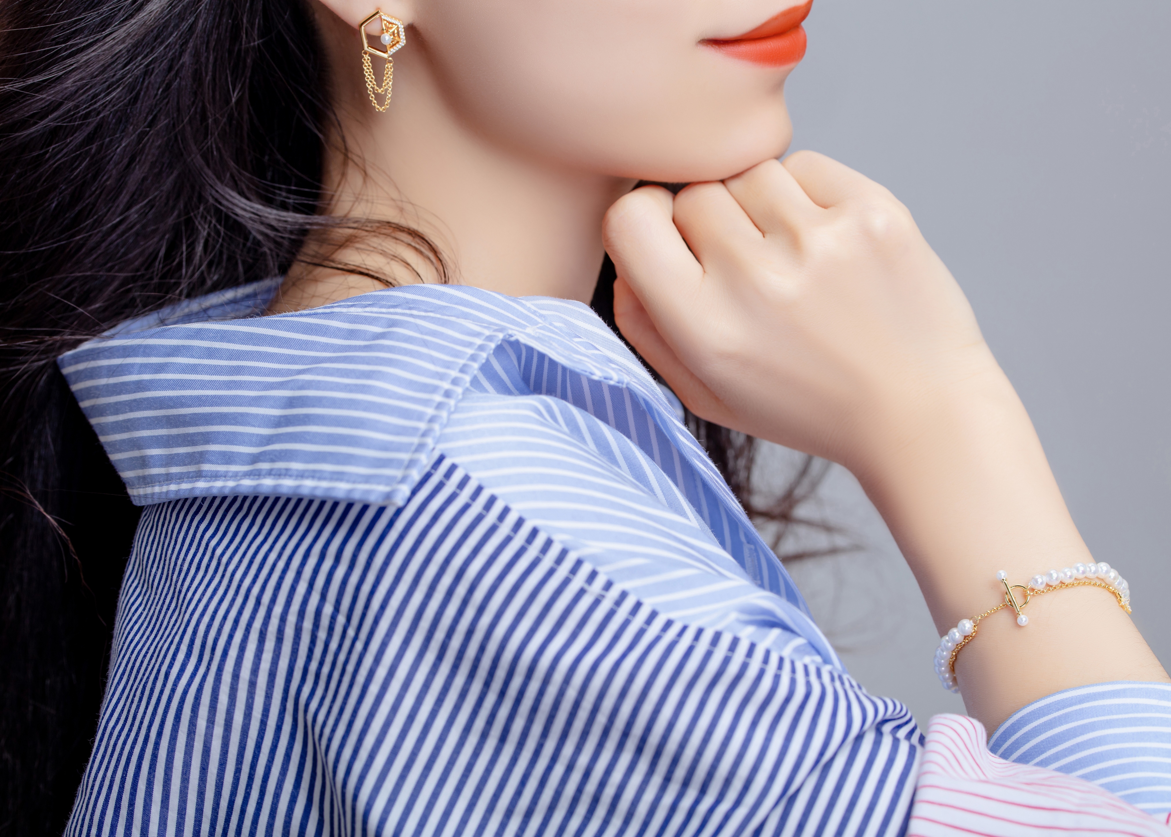 这套有点小清新的国风首饰,不仅具有中式建筑菱花窗的古典韵味,几何形呈现出简约摩登的风格,搭配温润的海水贝珠,举手投足都是优雅又时髦的文艺女郎。