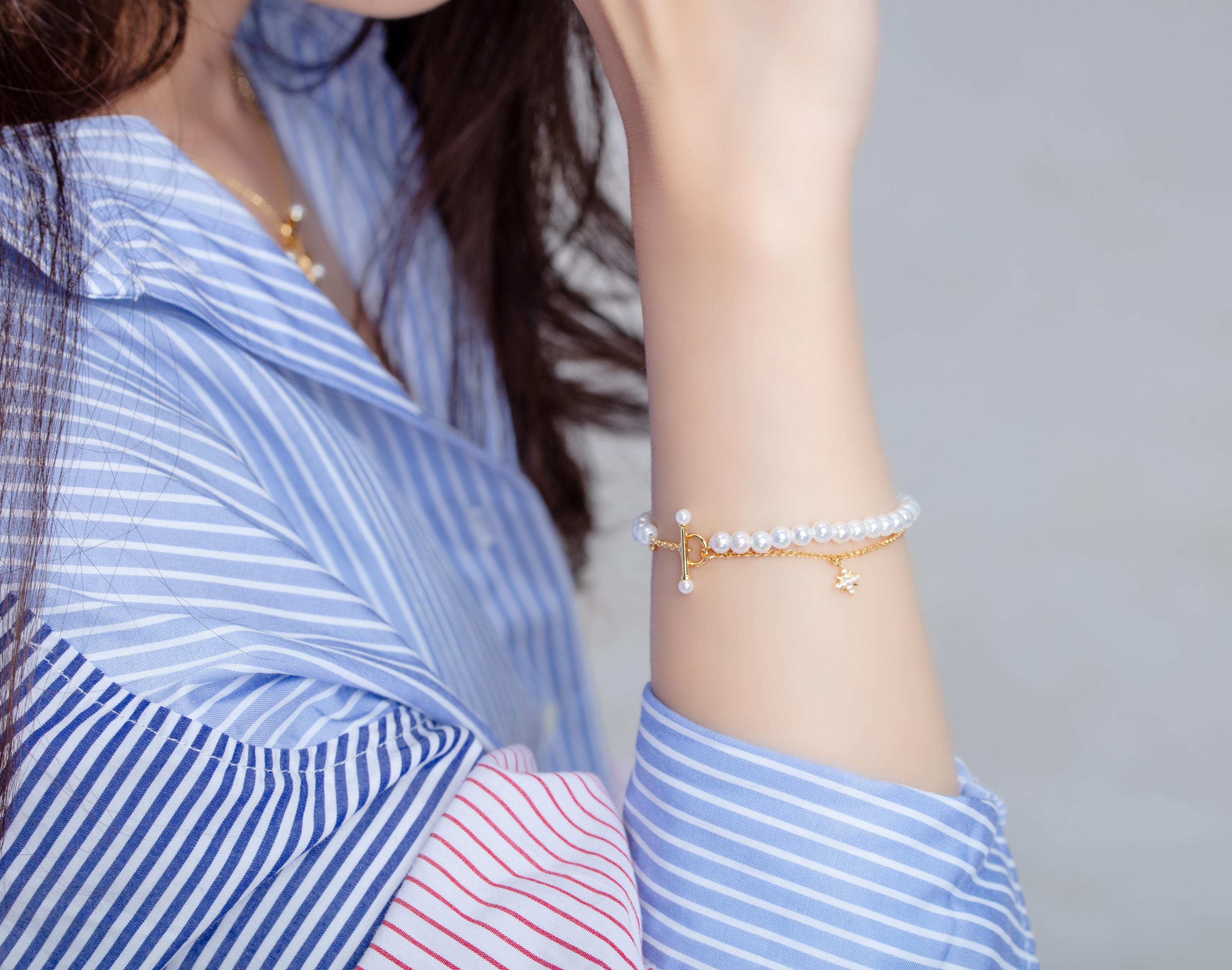 设计化繁为简,采用了与众不同的双层链设计。以整条贝珠还原菱花图上的金珠,呈现出柔和光感和东方美学意境。