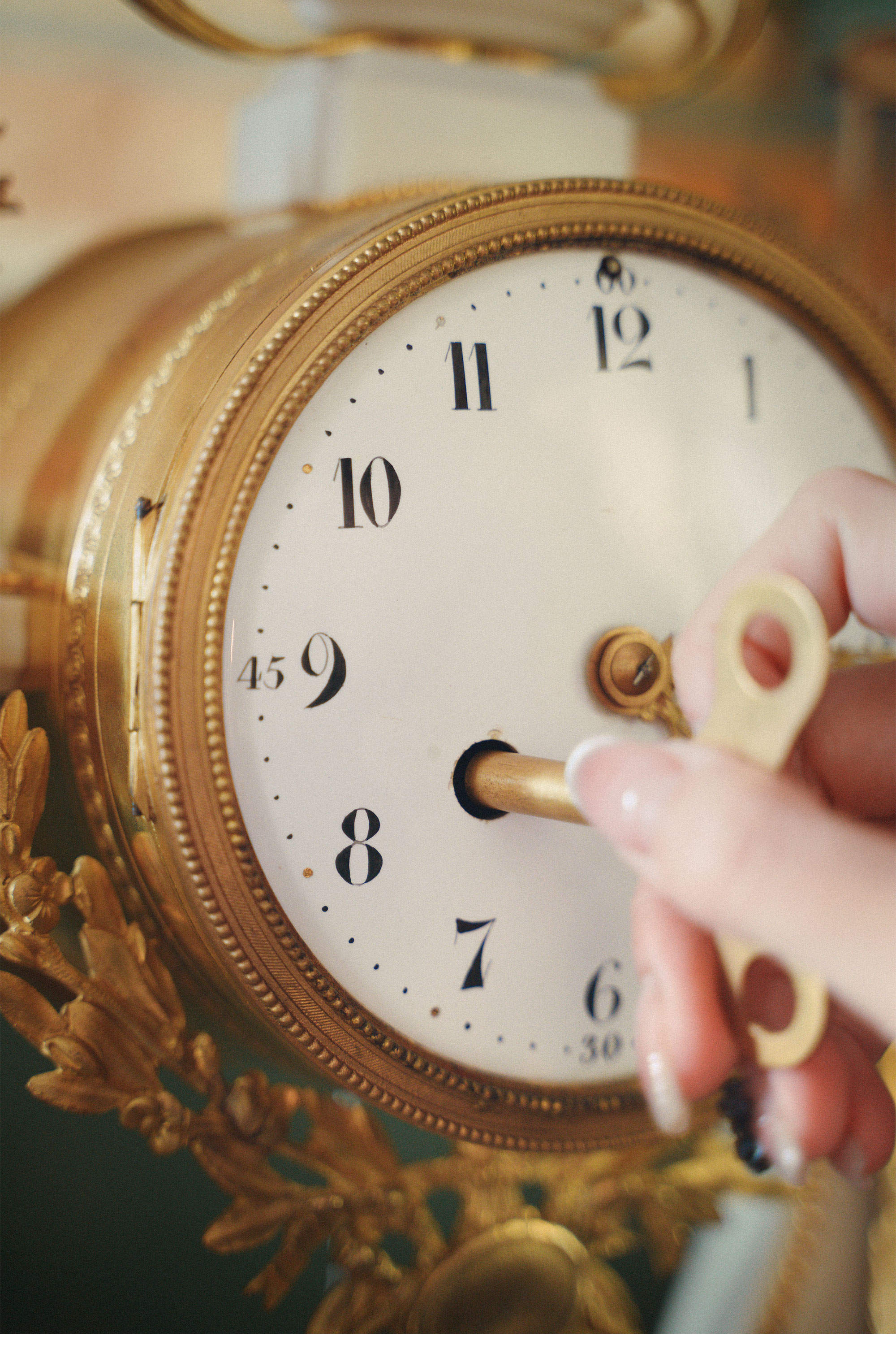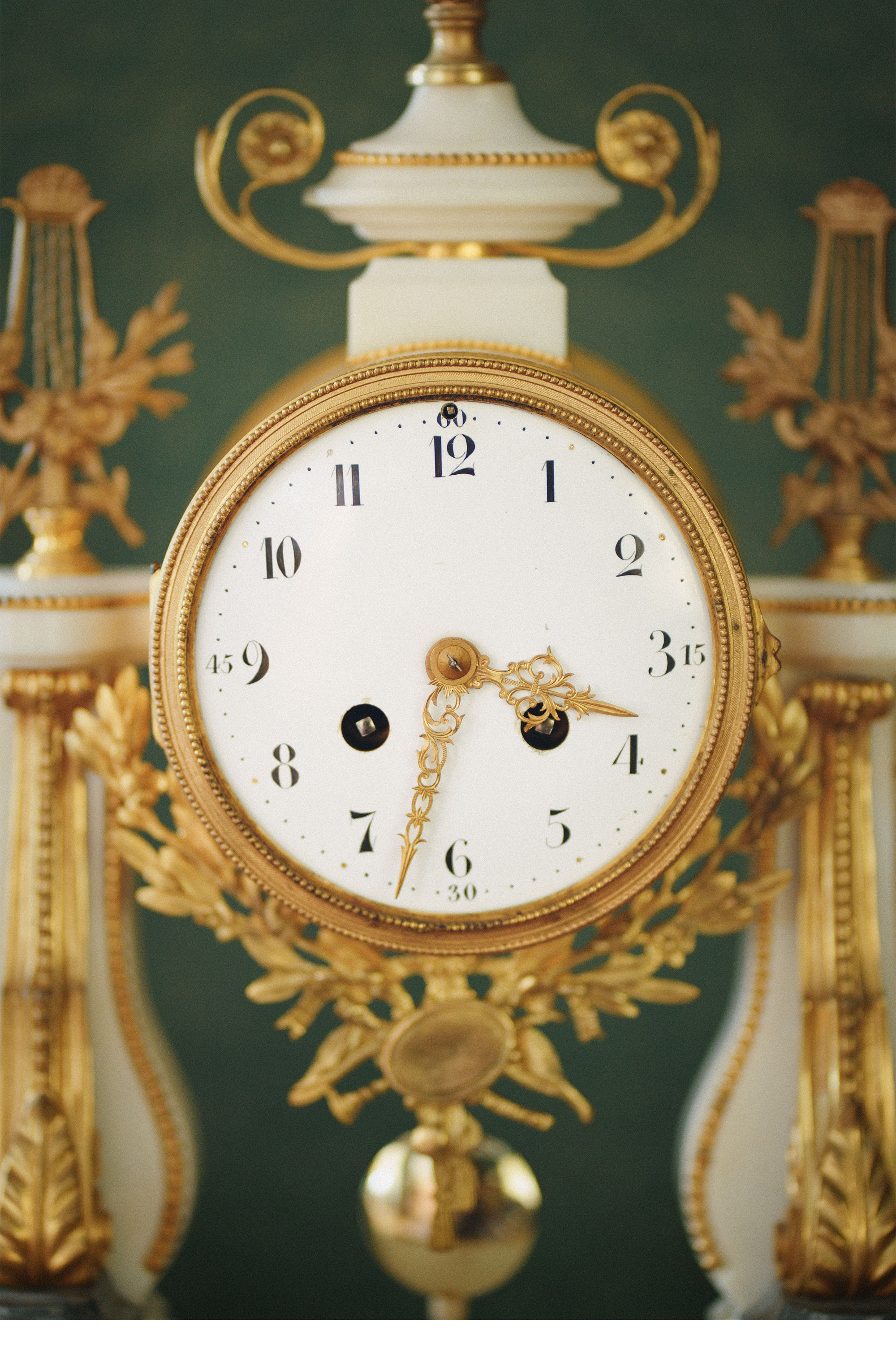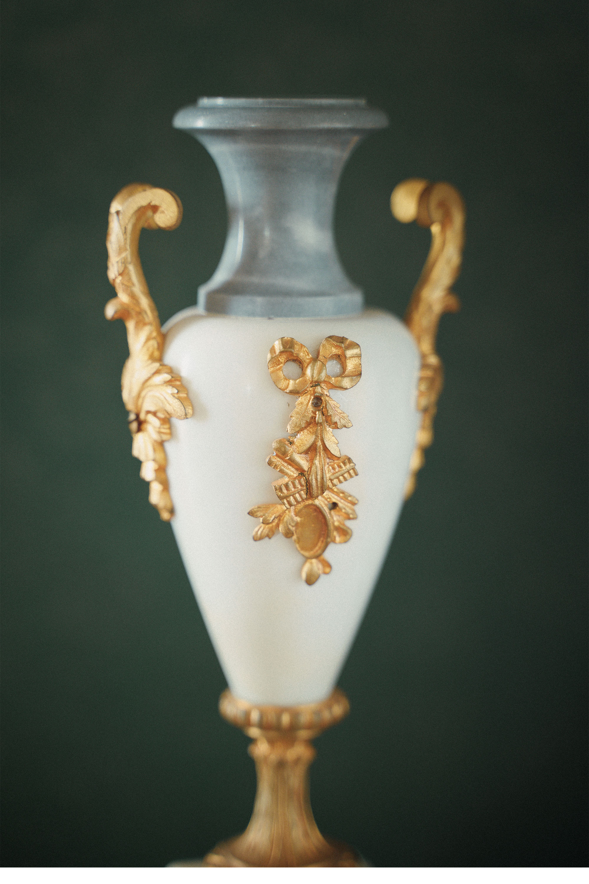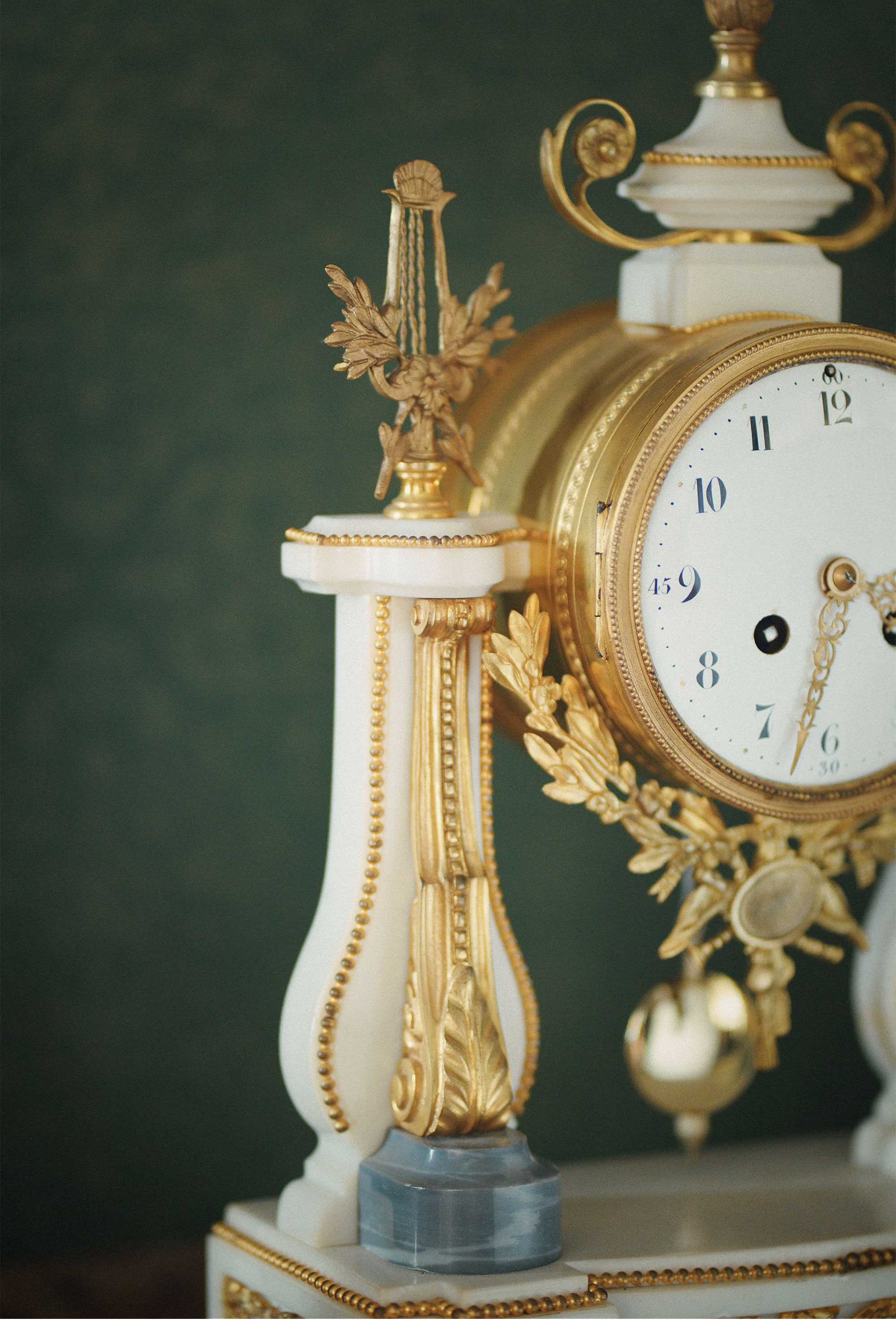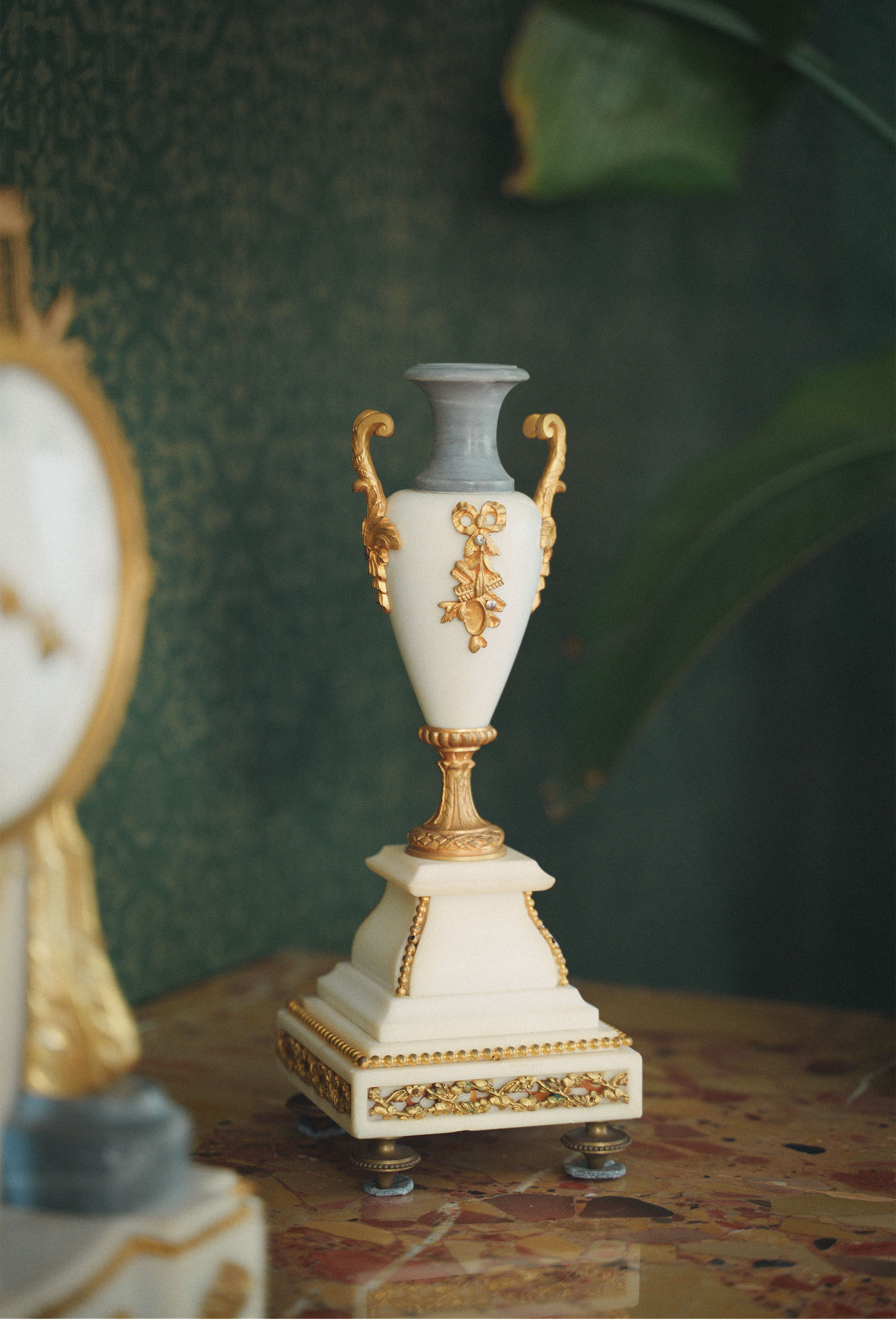 1890年代法国出品新古典主义风格铜鎏金镶嵌白色大理石壁炉座钟套件