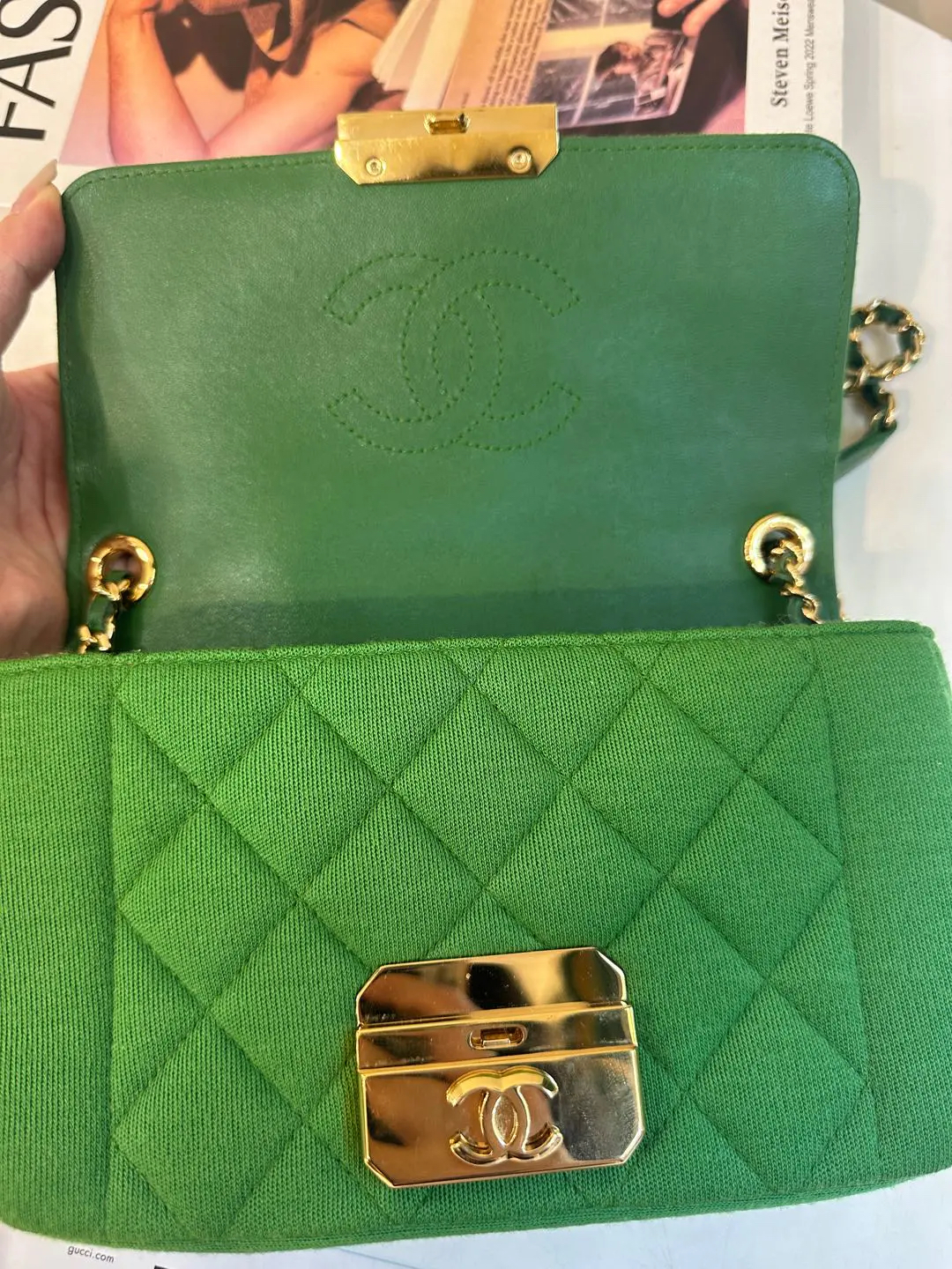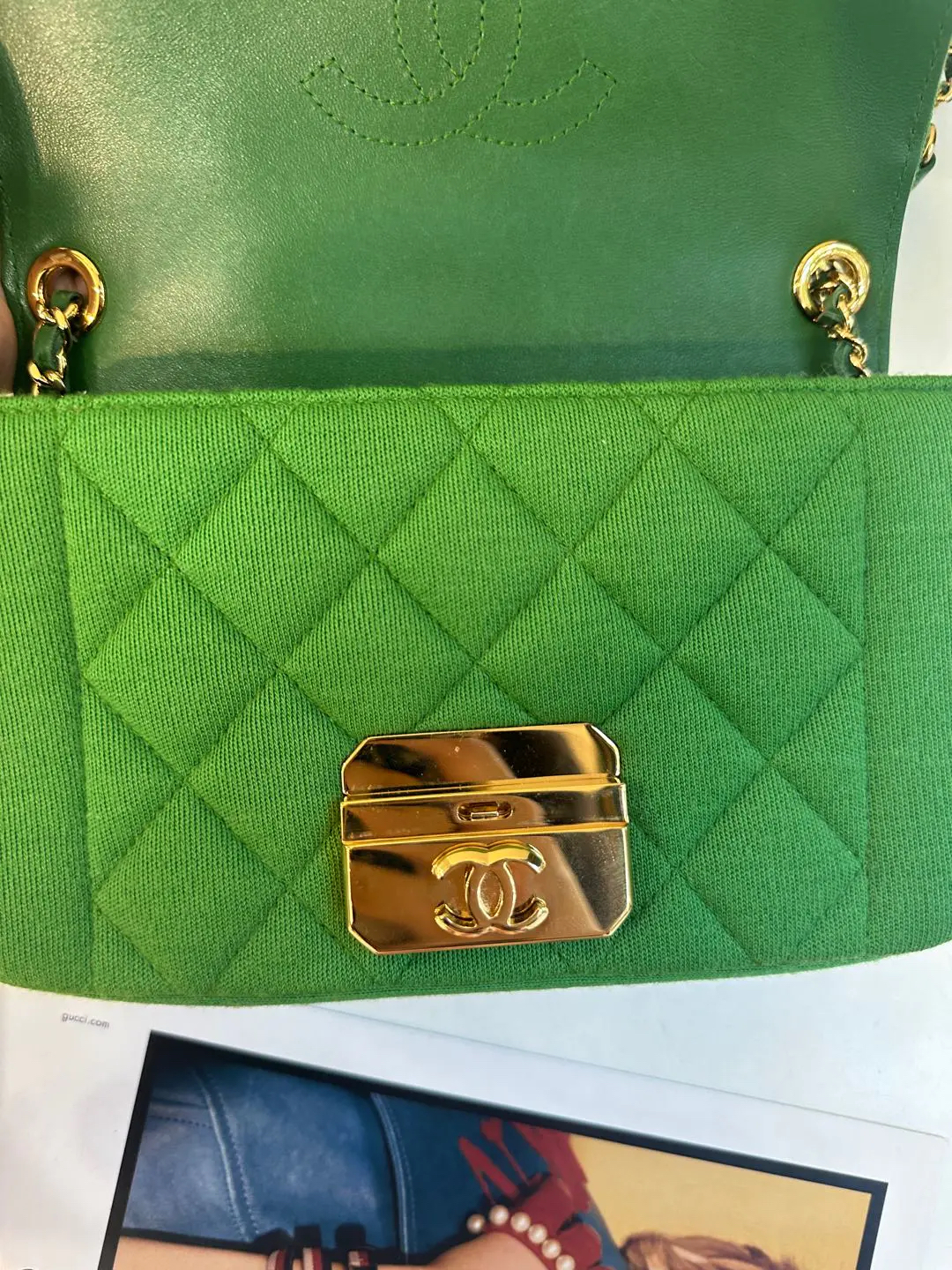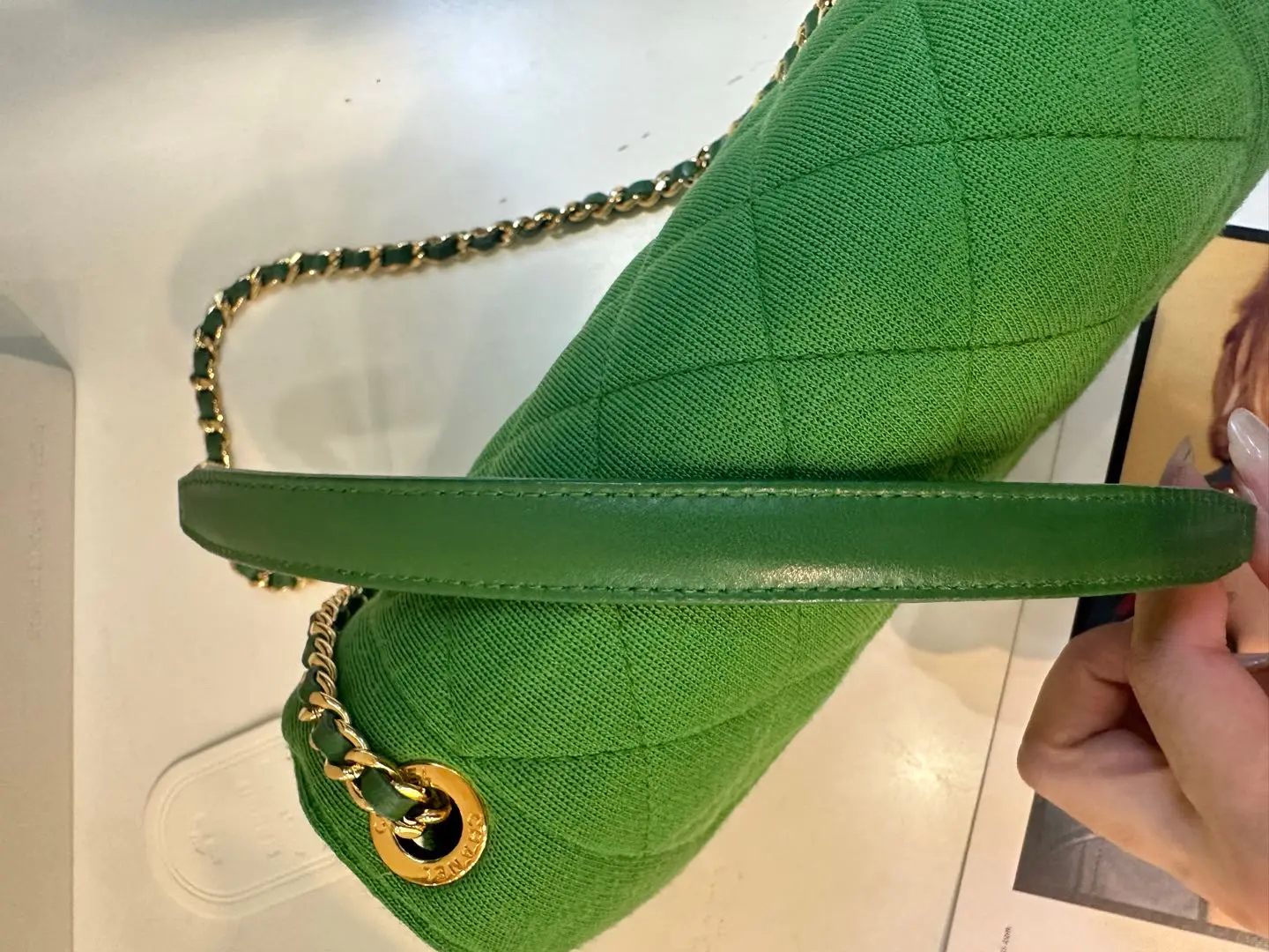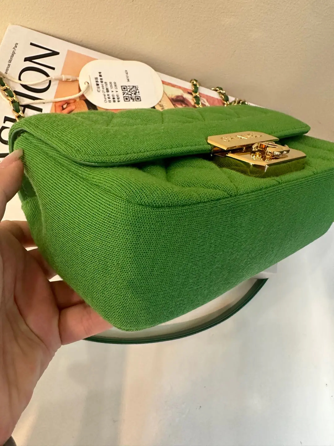 【商品详情】正品二手 Chanel Jersey 针织 绿色 mini 金扣 单肩包💙 95新 19×12 镭射19开 配件:卡。金属正常使用感。针织搭配金属刚柔并重 这个系列最好看的是绿色