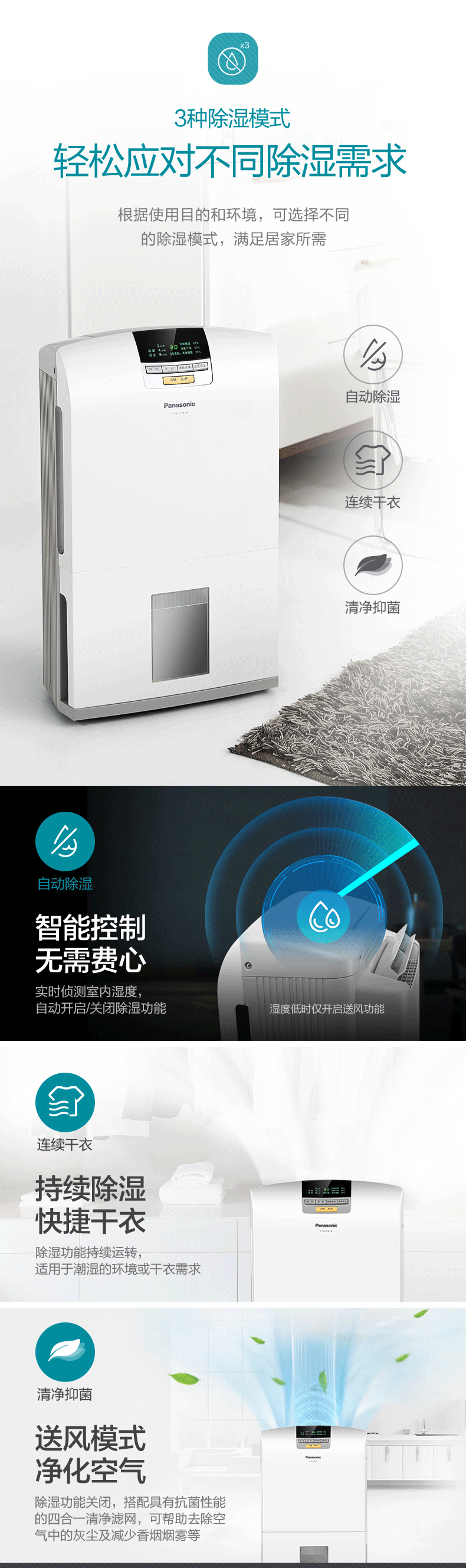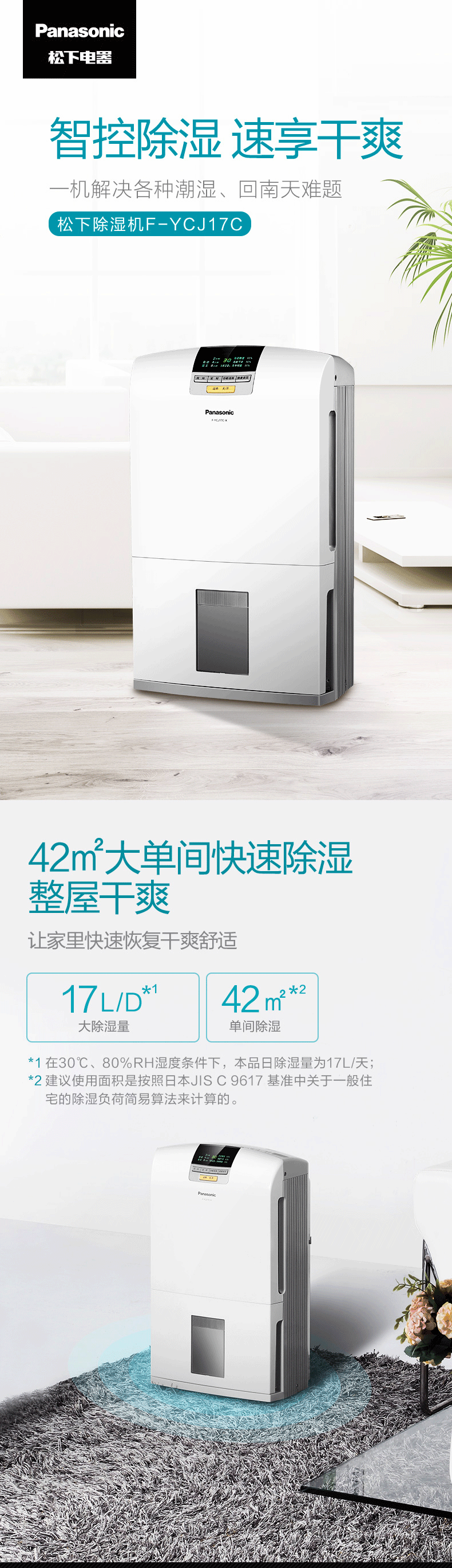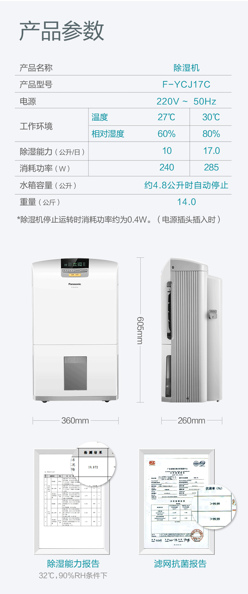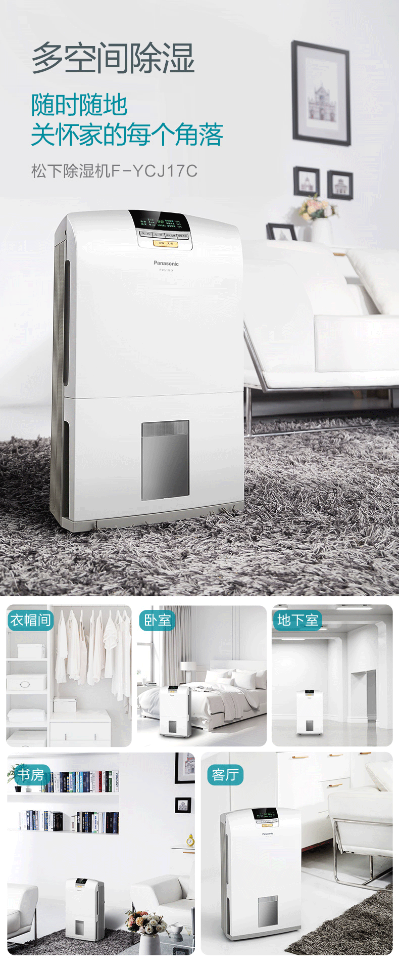 松下(Panasonic)除湿机 家用低音抽湿机除湿器可外接水管 F-YCJ17C-X