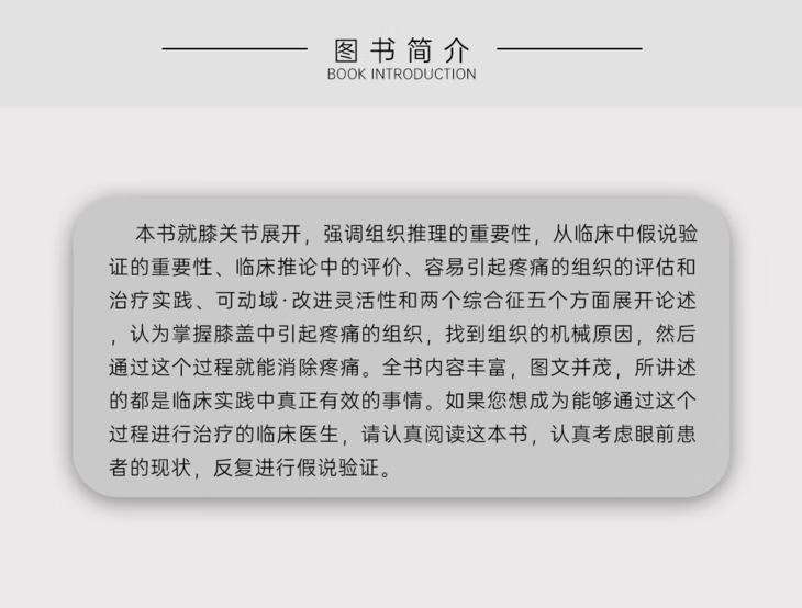 本书就膝关节展开,强调组织推理的重要性,从临床中假说验证的重要性、临床推论中的评价、容易引起疼痛的组织的评估和治疗实践、可动域·改进灵活性和两个综合征五个方面展开论述,认为掌握膝盖中引起疼痛的组织,找到组织的机械原因,然后通过这个过程就能消除疼痛。全书内容丰富,图文并茂,所讲述的都是临床实践中真正有效的事情。如果您想成为能够通过这个过程进行治疗的临床医生,请认真阅读这本书,认真考虑眼前患者的现状,反复进行假说验证。