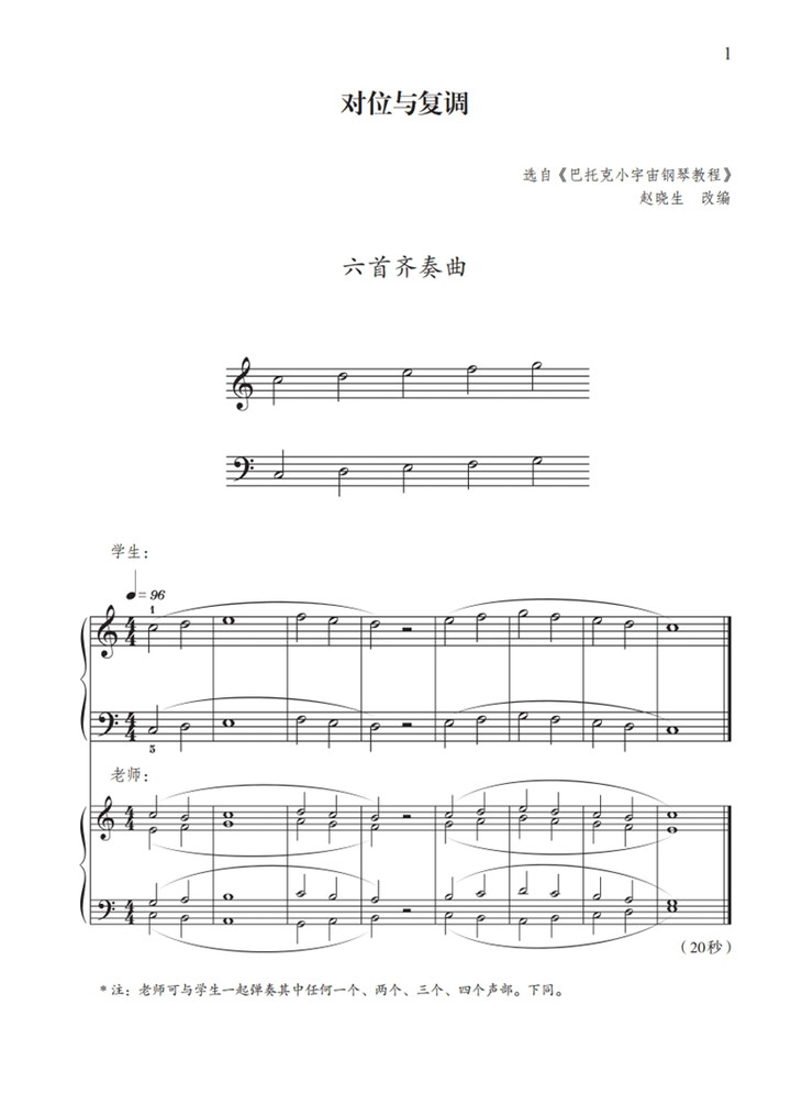 本套教程是作曲家、钢琴家、音乐教育家赵晓生教授结合自身多年的钢琴教学经验精心撰写的一套适用于少年儿童和成人的钢琴入门教程,该教程贯穿了“开启天聪,深播乐种”的基本思路,不仅教授学生钢琴演奏的基本技能,还对音程、节奏、和声、调式、调性等乐理概念进行了启发式教学,以培养学生乐感为出发点,打造了多位一体的钢琴教学模式。相信通过对本套教程的学习,钢琴学习者们可以通过开发听觉,了解音乐特性,感受音乐,从而学会音乐表达。同时,书中师生合奏如四手联弹及双钢琴演奏的教学模式可以营造轻松有趣的音乐教学氛围,极大程度地提高同学们的演奏积极性,体会钢琴学习的无限乐趣。