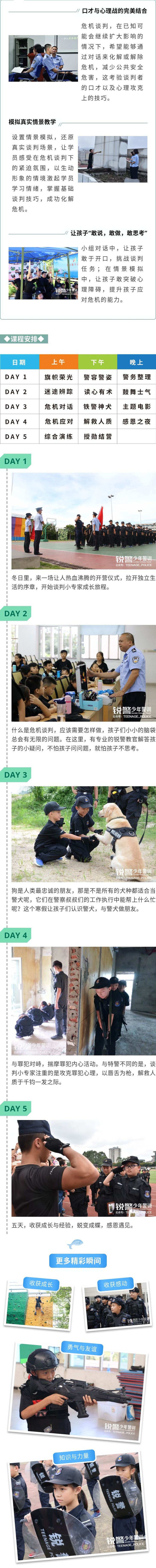 - 锐警少年警训致力于打造“营地教育+安全教育”领航品牌。以专业的警务特色课程体系,为青少年提供沉浸式安全教育,锻造外展自我、内拓素质的现代英武少年。
