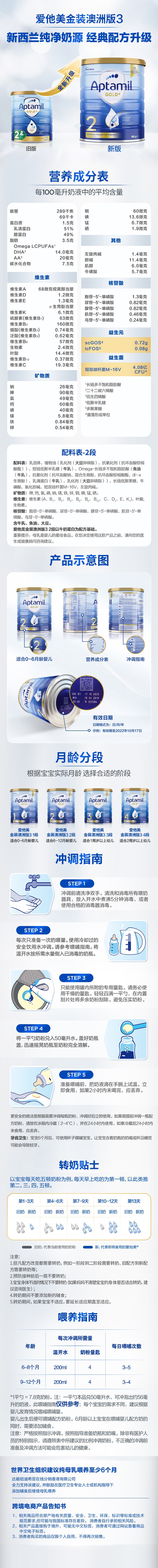 【保税】澳洲爱他美aptamil金装奶粉2段900g(新老包装随机发货)