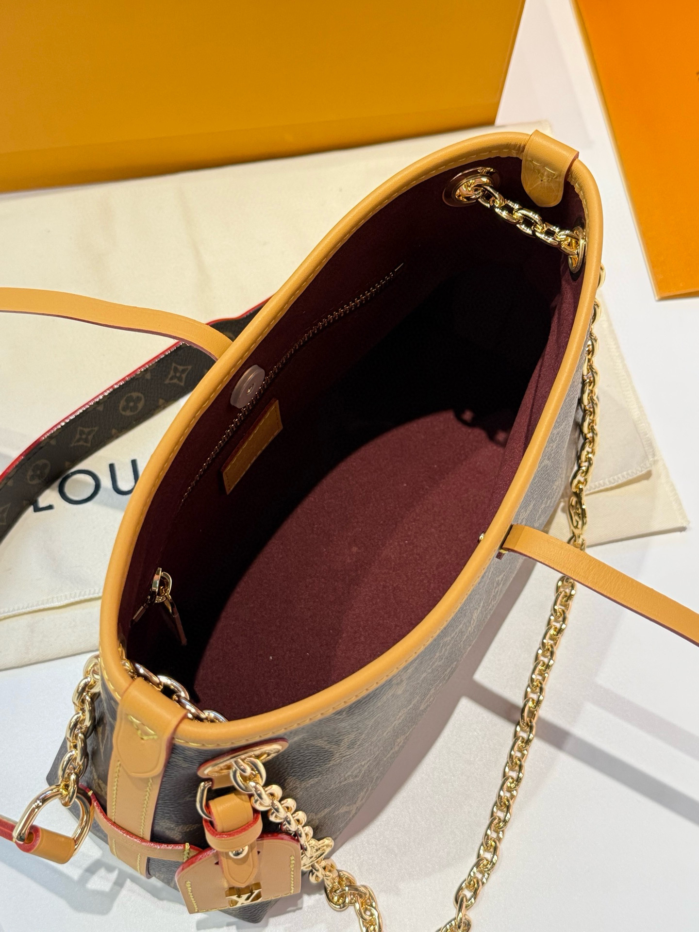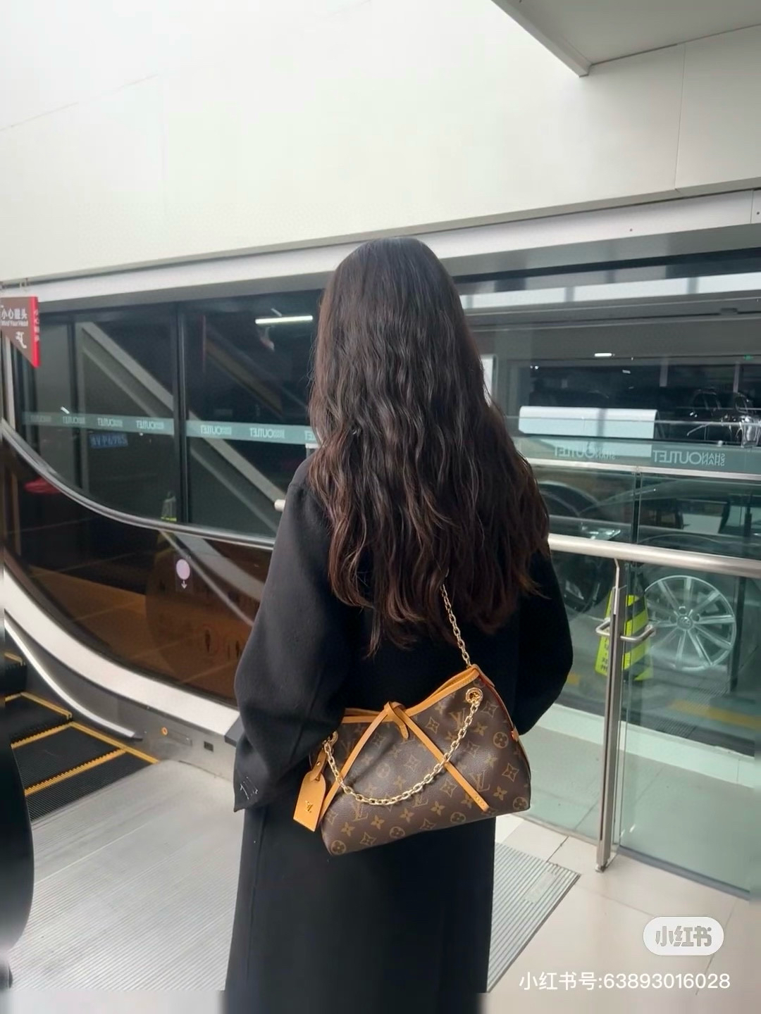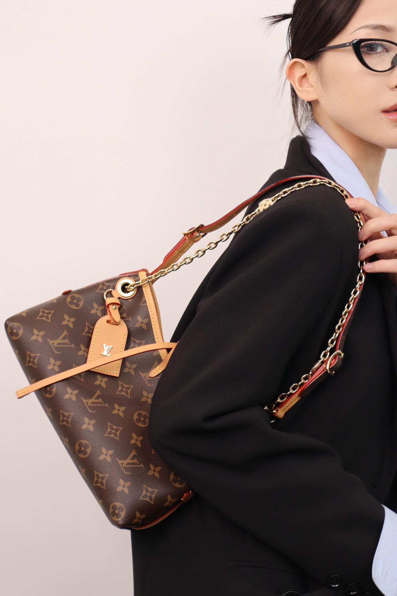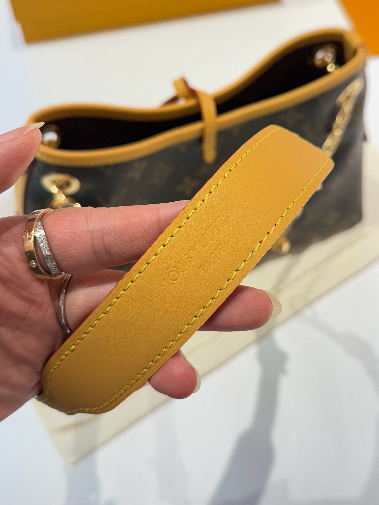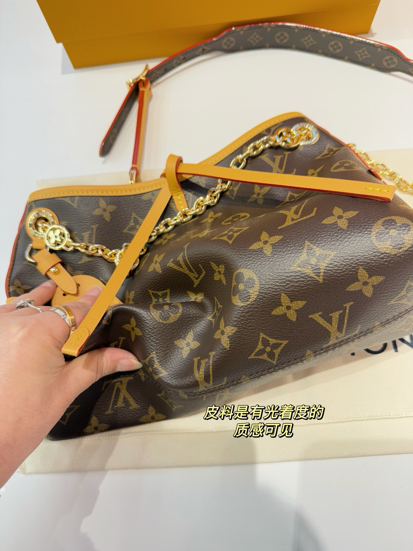 🔺五金质感非常出色。从图片中可以看到,链条部分光泽度高,金属色泽纯正,呈现出一种奢华且精致的感觉。五金与Monogram帆布和皮质部分的衔接自然流畅,没有任何粗糙感,彰显出工艺上的高水准。这种高品质的五金不仅在视觉上给人以高端大气的印象,而且在耐用性方面也有保障,能够长时间保持其亮丽的外观,不会轻易出现褪色或磨损的情况,为整个包包增添了一份高贵与典雅。~