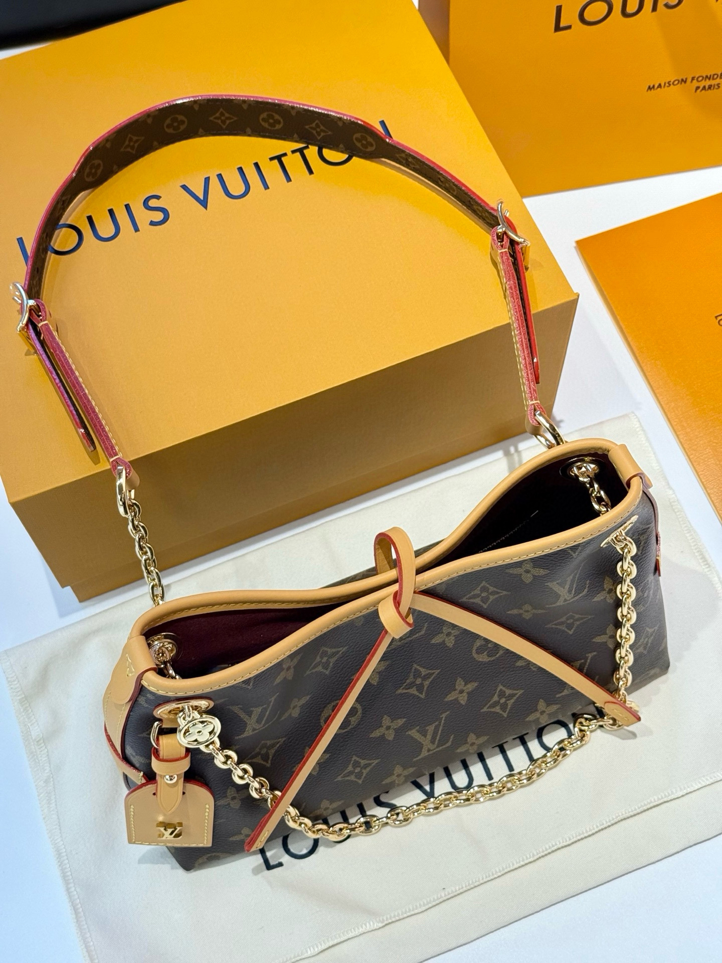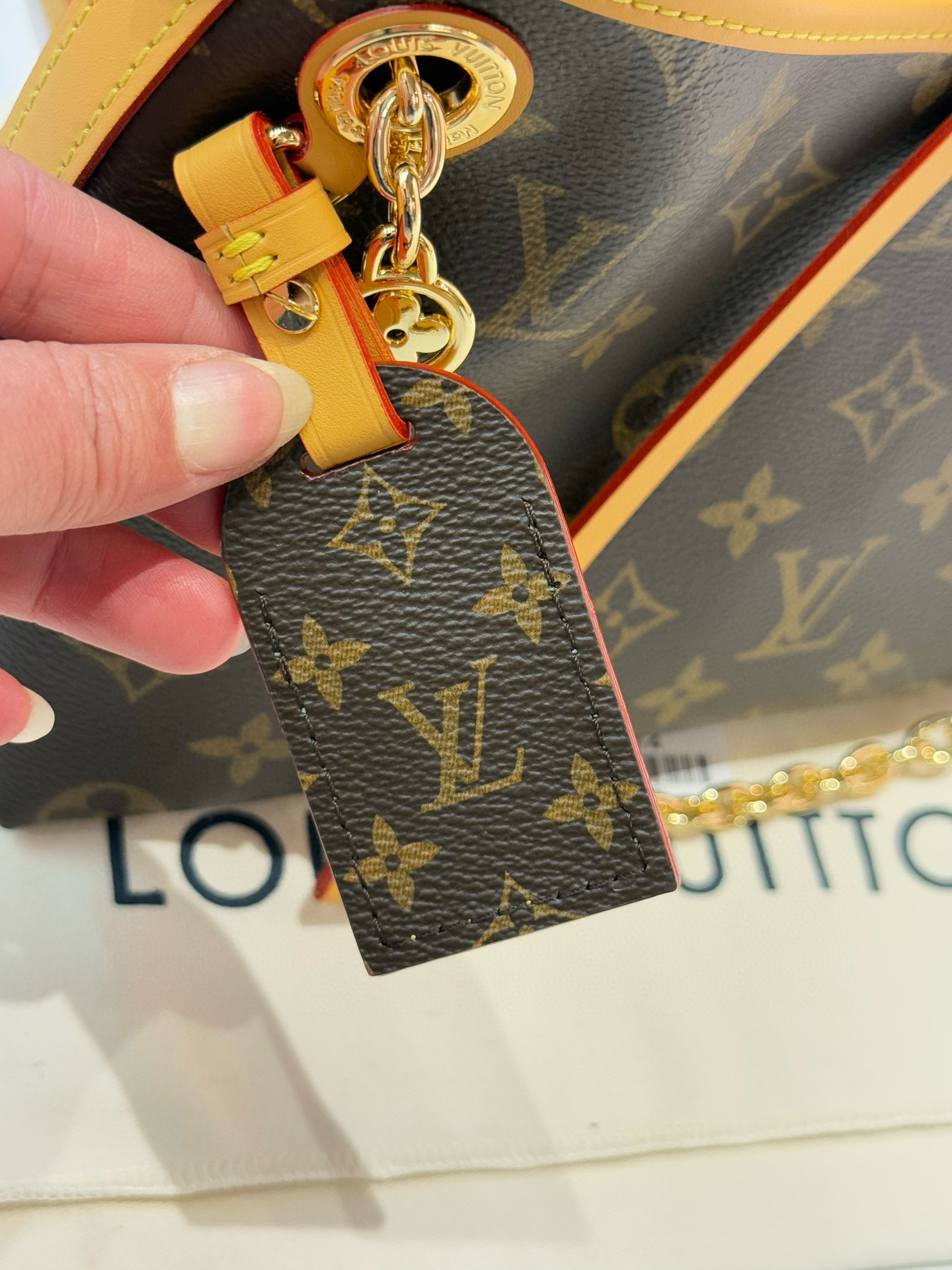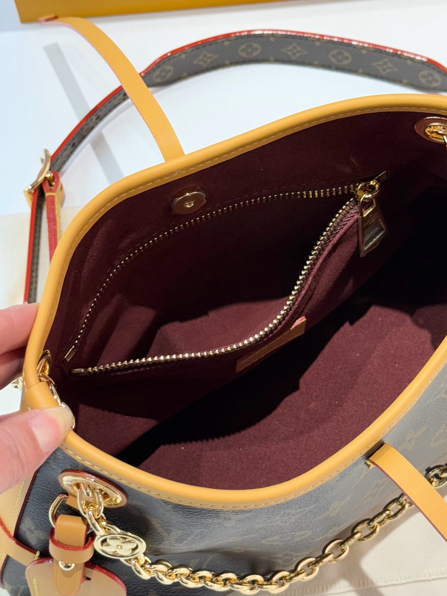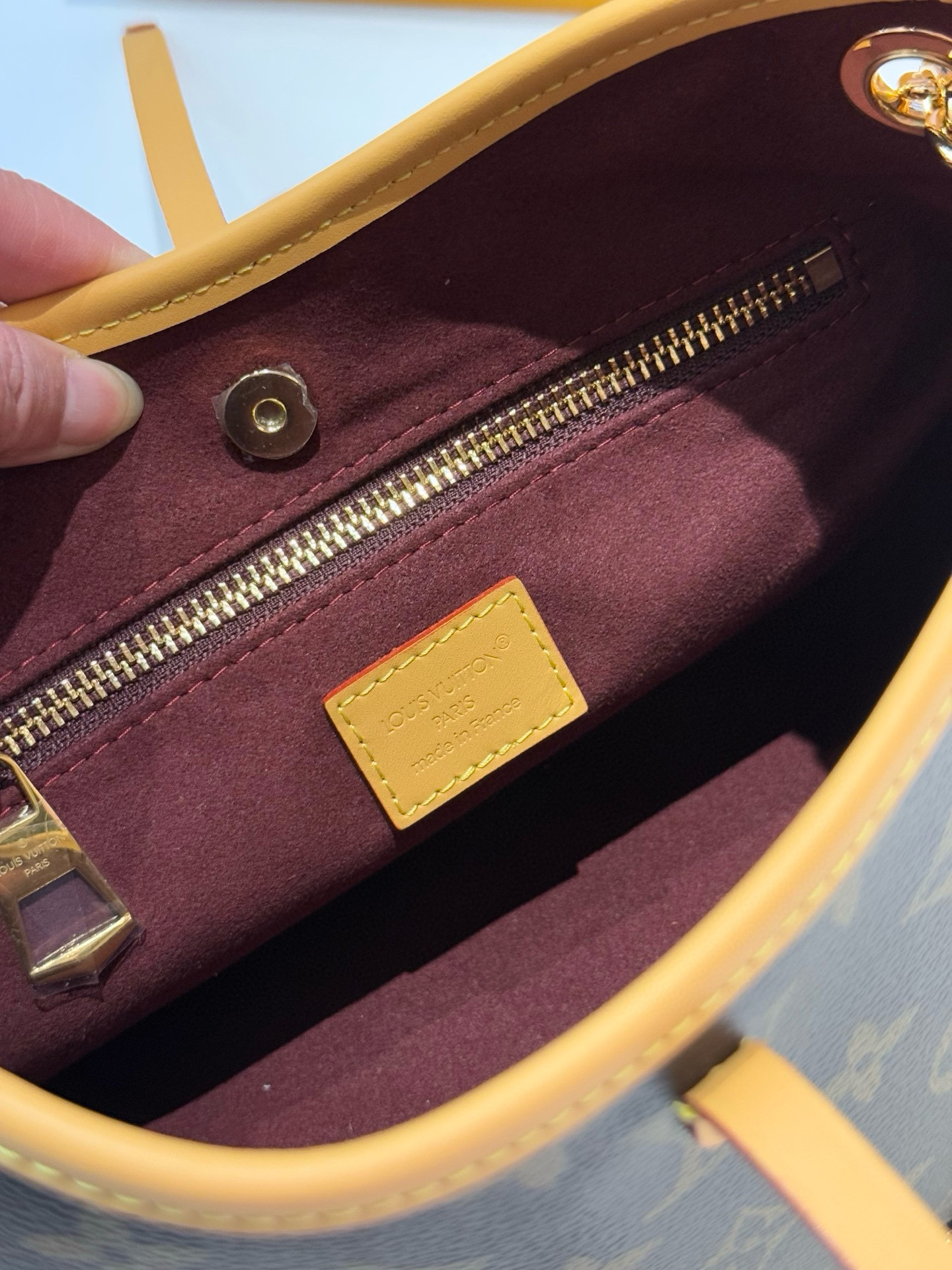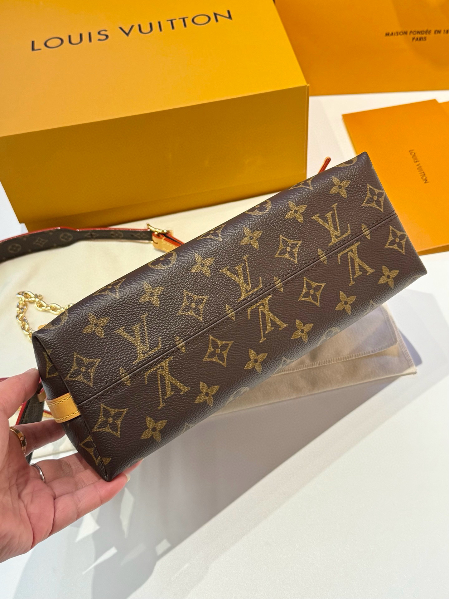 🔺五金质感非常出色。从图片中可以看到,链条部分光泽度高,金属色泽纯正,呈现出一种奢华且精致的感觉。五金与Monogram帆布和皮质部分的衔接自然流畅,没有任何粗糙感,彰显出工艺上的高水准。这种高品质的五金不仅在视觉上给人以高端大气的印象,而且在耐用性方面也有保障,能够长时间保持其亮丽的外观,不会轻易出现褪色或磨损的情况,为整个包包增添了一份高贵与典雅。~