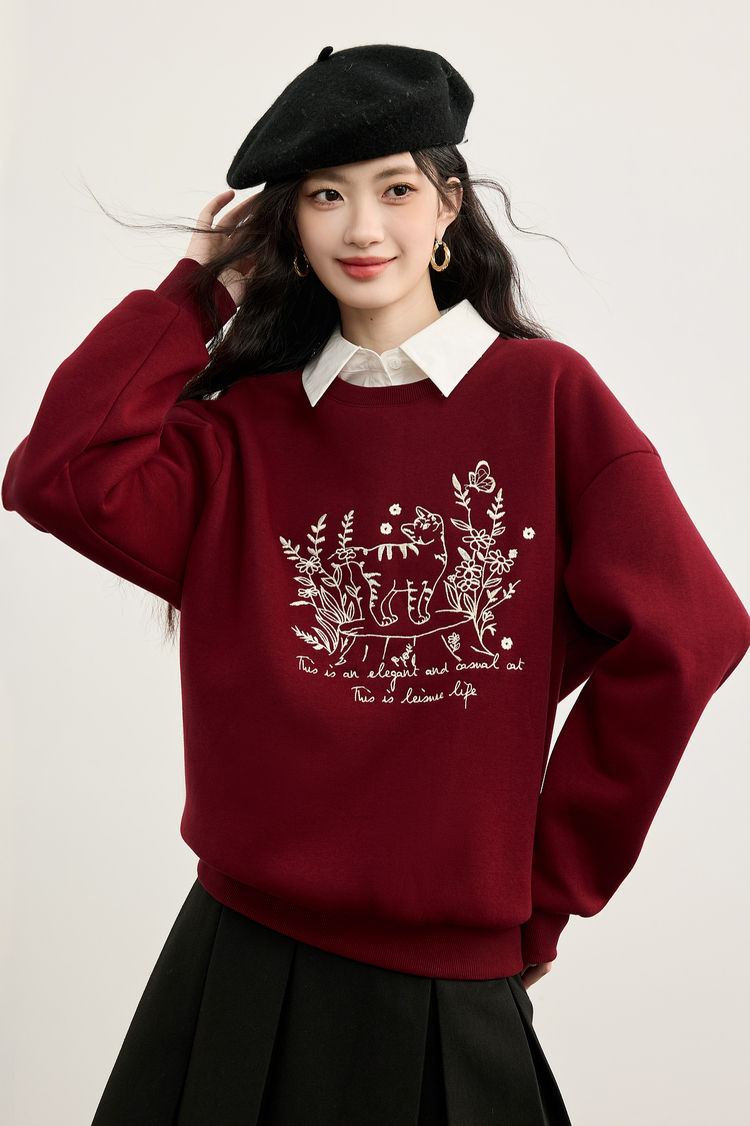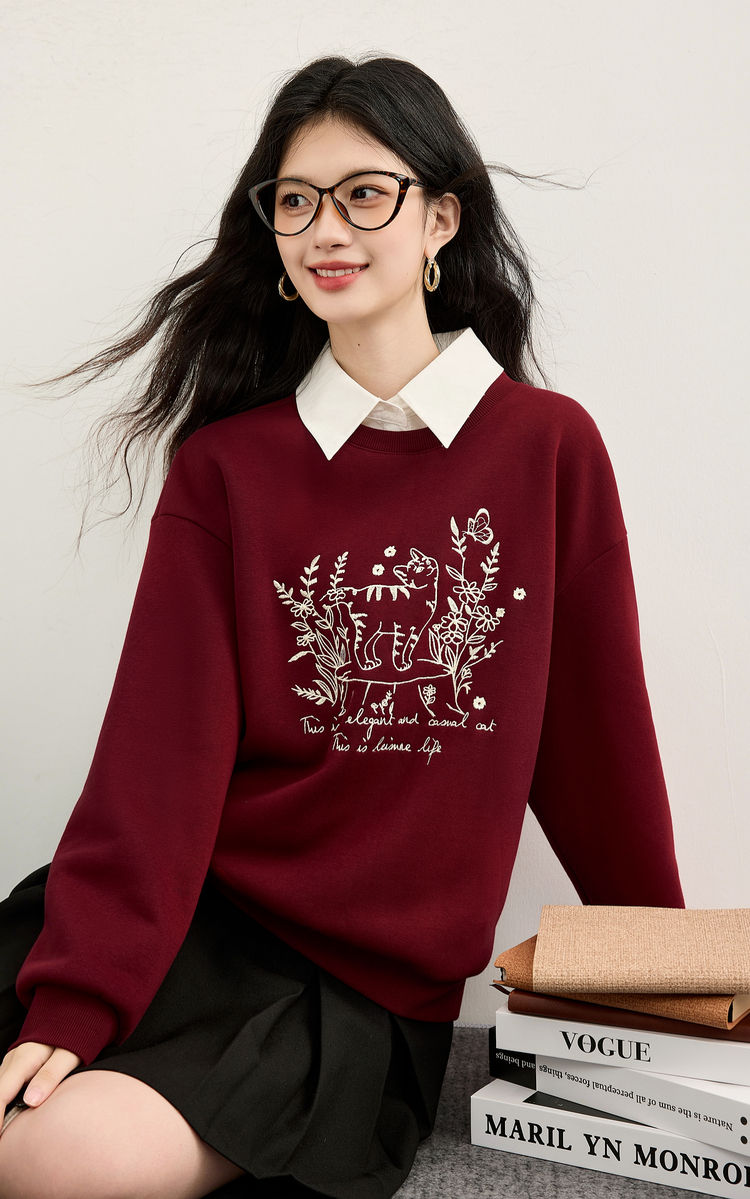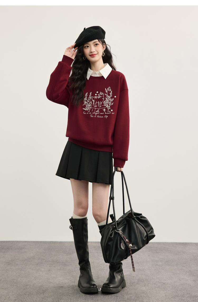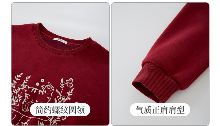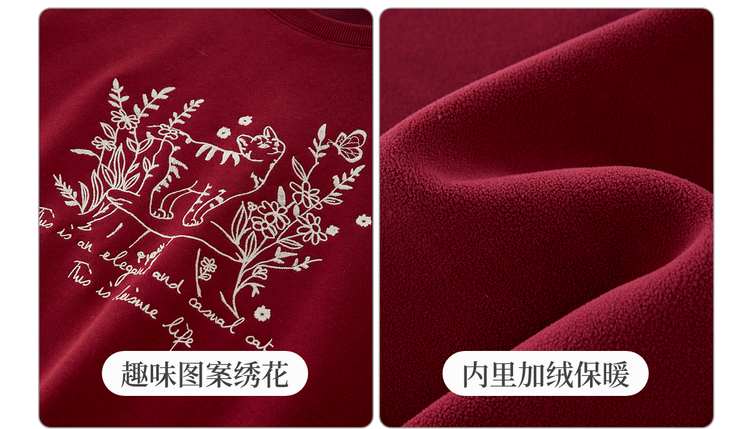 【周末秒杀】熙世界miu系酒红色加绒卫衣女宽松慵懒美式刺绣上衣2025秋冬新款